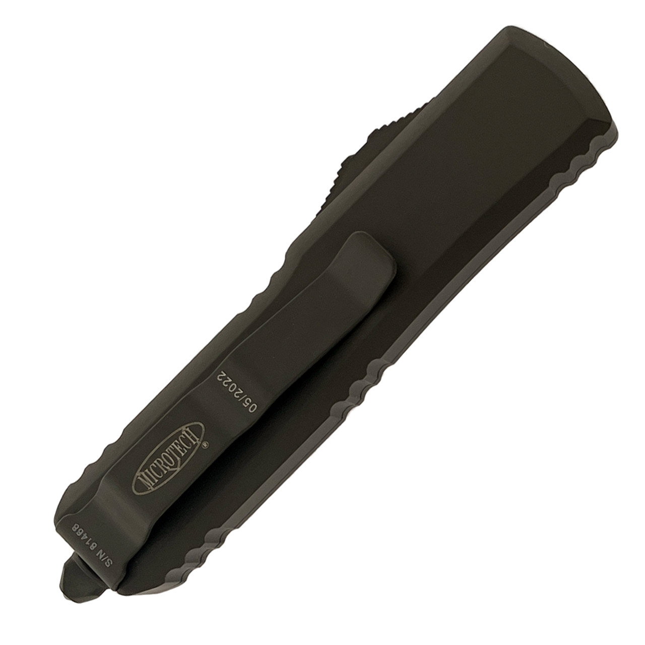 This model features OD Green Cerakote coated 6061-T6 aluminum handle scales, the front has the Microtech Claw logo. OD Green Cerakote coated M390 stainless steel tanto blade. OD Green Cerakote finished hardware, pocket clip, and glass breaker tip. The blade has the Microtech logo and model information. The pocket clip has the Microtech logo, serial number, and production date. Brand new in box.