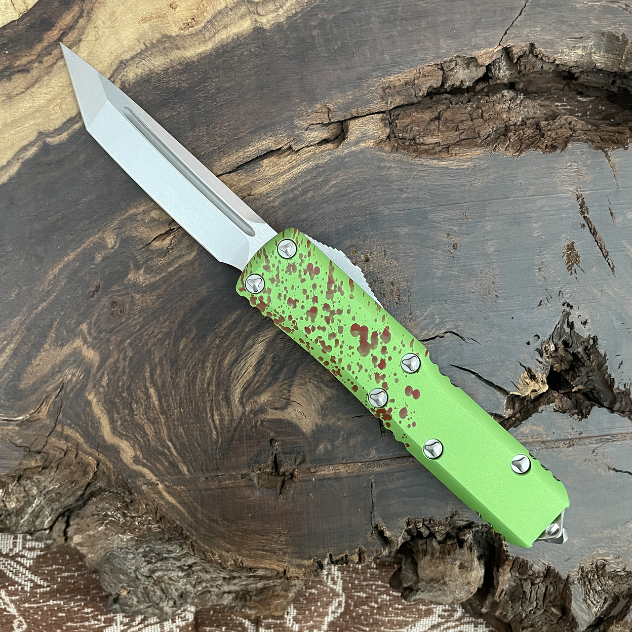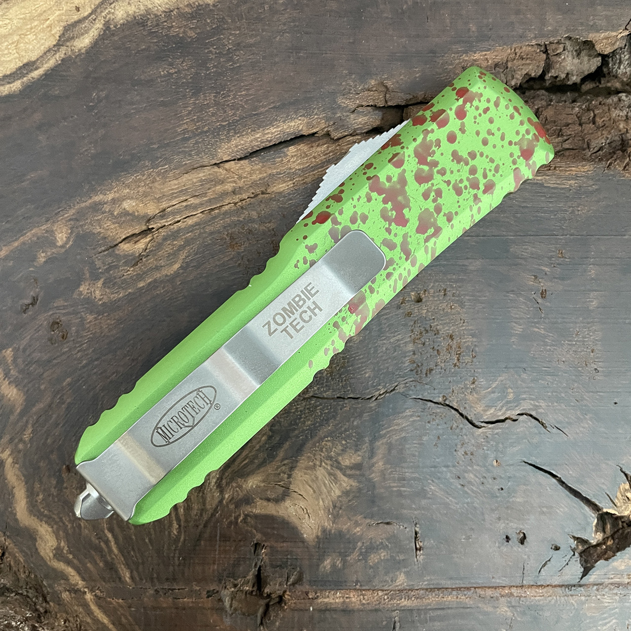This model featuresaluminum handle scales with zombie green with random red "blood" spatter hardware. Stonewash finished M390 stainless steel tanto edge blade. Beadblast finished hardware, reversible pocket clip, lanyard hole, and glass breaker. The Zombie models are sterile with no markings other than the Microtech logo and Zombie Tech on the pocket clip. Brand new in box.