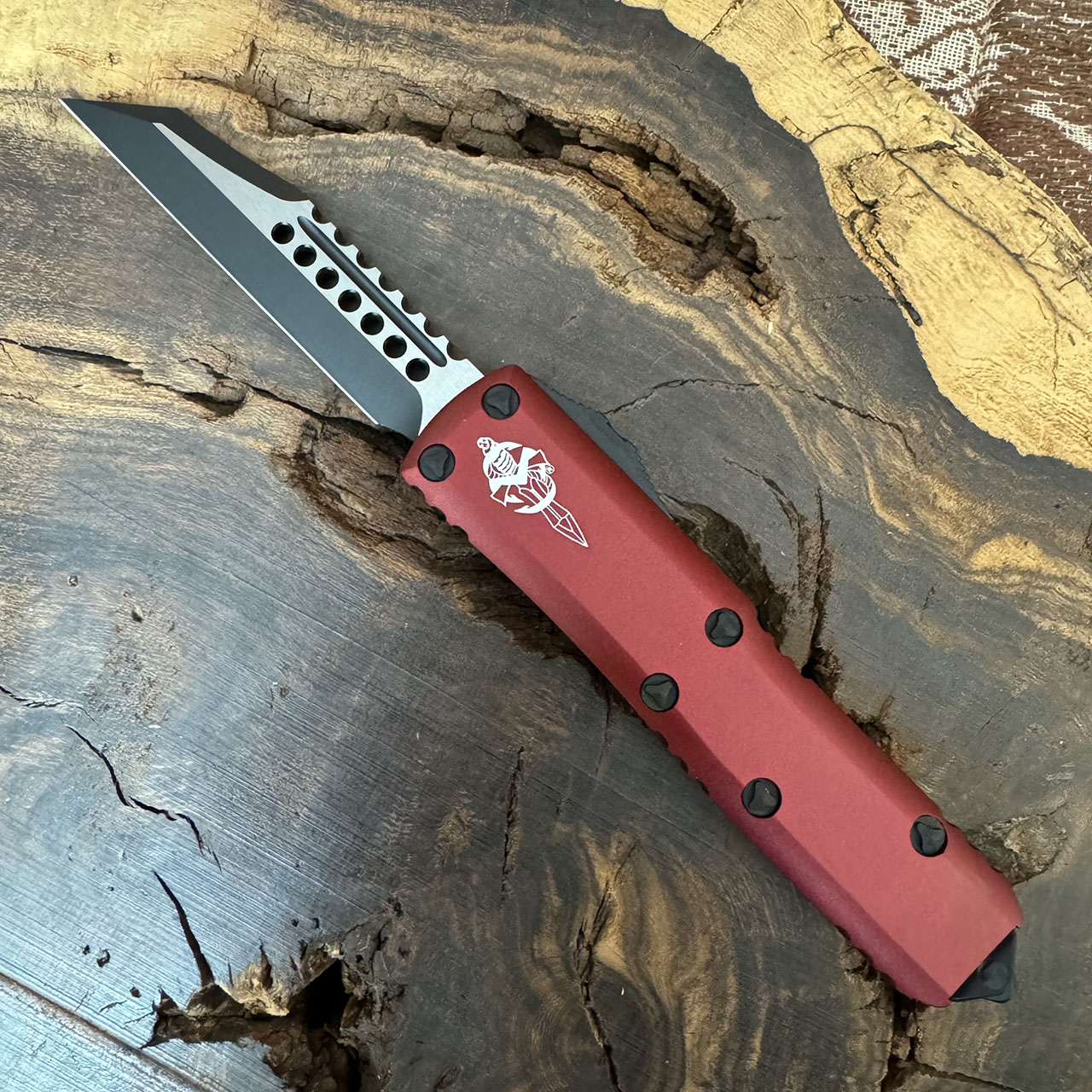 Microtech has updated and refined the UTX-85 model. It features improved ergonomics, with rounded handle faces, and patches of grooves along the sides to ensure excellent grip. The firing button has been redesigned to increase surface contact for effective engagement, and the glass breaker has a ball-tip set in the trip-angle pattern base to increase its everyday carry manners. Based on the Ultratech platform, the UTX-85 is scaled down to 85% of its length. The UTX-85 is an appealing option for those who prefer a smaller EDC knife and value Microtech's high-performance out-the-front action and exceptional build quality.