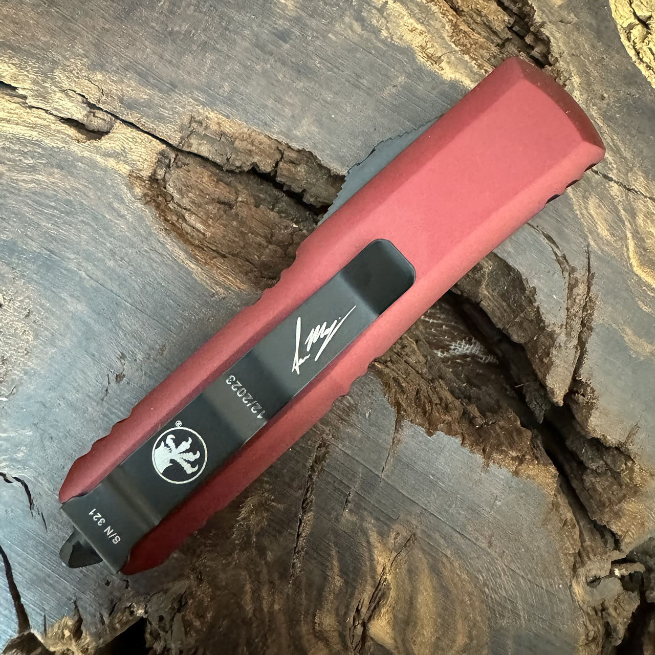 This Signature Series model features merlot finished 6061-T6 aluminum handle scales. Black M390 stainless steel warhohund with standard cutting edge. Black finished hardware, pocket clip, and glass breaker tip. The pocket clip has the Signature Series logo, Claw logo, serial number, and production date. Brand new in box.