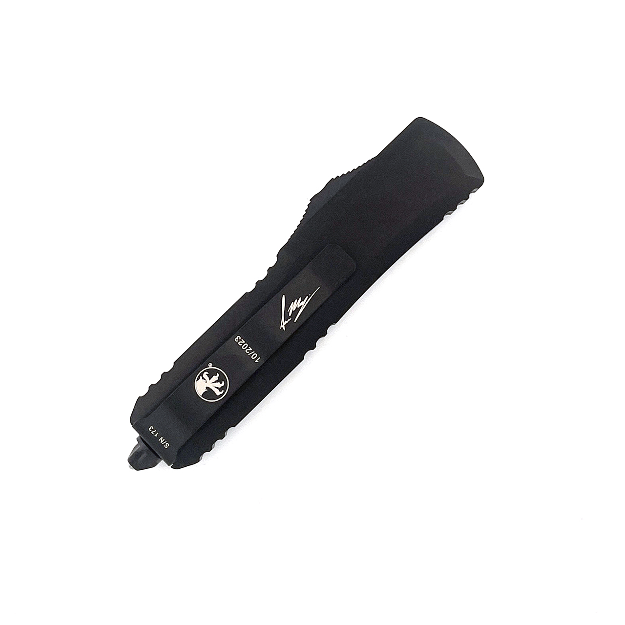 This Signature Series model features black tactical finished 6061-T6 aluminum handle scales. Black Tactical finished M390 stainless steel warhohund with standard cutting edge. Black finished hardware, pocket clip, and glass breaker tip. The pocket clip has the Signature Series logo, Claw logo, serial number, and production date. Brand new in box.