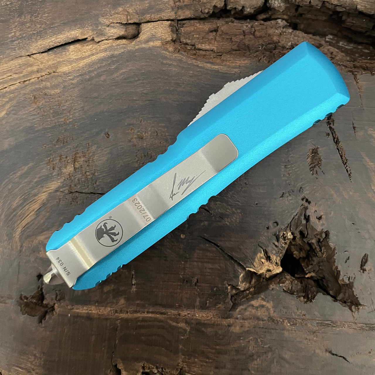 This Signature Series model features turquoise finished 6061-T6 aluminum handle scales. Stonewash finished M390 stainless steel warhohund with standard cutting edge. Bead Blast finished hardware, pocket clip, and glass breaker tip. The pocket clip has the Signature Series logo, Claw logo, serial number, and production date. Brand new in box.