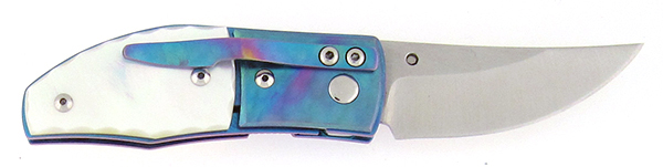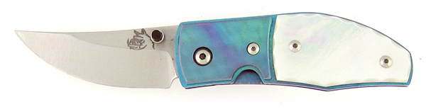 Beautiful genuine mother of pearl handle scales on top of an elegantly anodized titanium frame. Satin finished stainless steel upswept blade featuring the Hawg logo. The thumb stud and titanium liner lock provide for easy operation and solid lock up. Beautiful matching titanium pocket clip for tip down carry. A fine gentlemen's pocket knife by Mike Franklin! Comes new in a black zip up pouch.