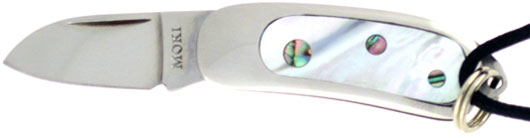 Hand Made Moki Knife. Mirror polished stainless steel handle scales, the front scale is inlaid with beautiful genuine mother of pearl and three abalone circles. Mirror polished stainless steel blade. Protruding tang with lanyard hole. Keychain ring with necklace. Comes brand new in box with a leather slip over pouch.