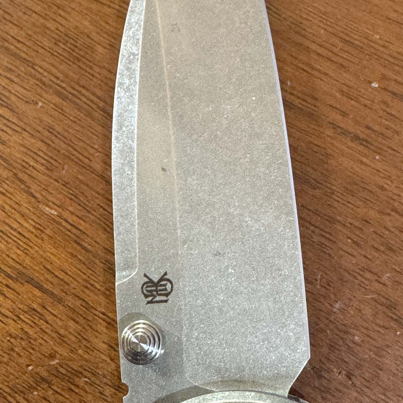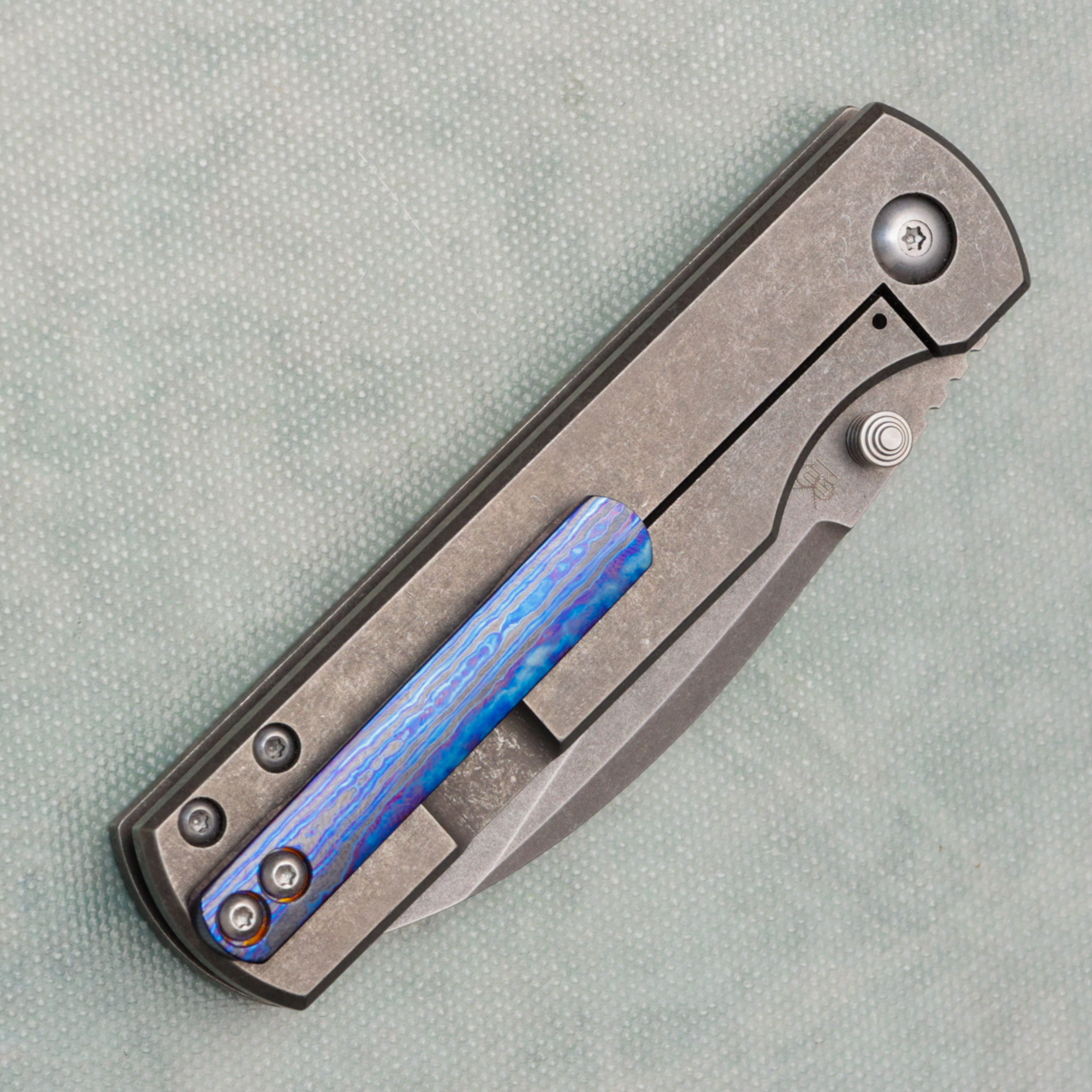 This model features a stonewash Magnacut blade with standard cutting edge, Titanium handles. Timascus pocket clip. back of blade stonewash has a two small dark marks in the stonewash, otherwise like new in pouch.