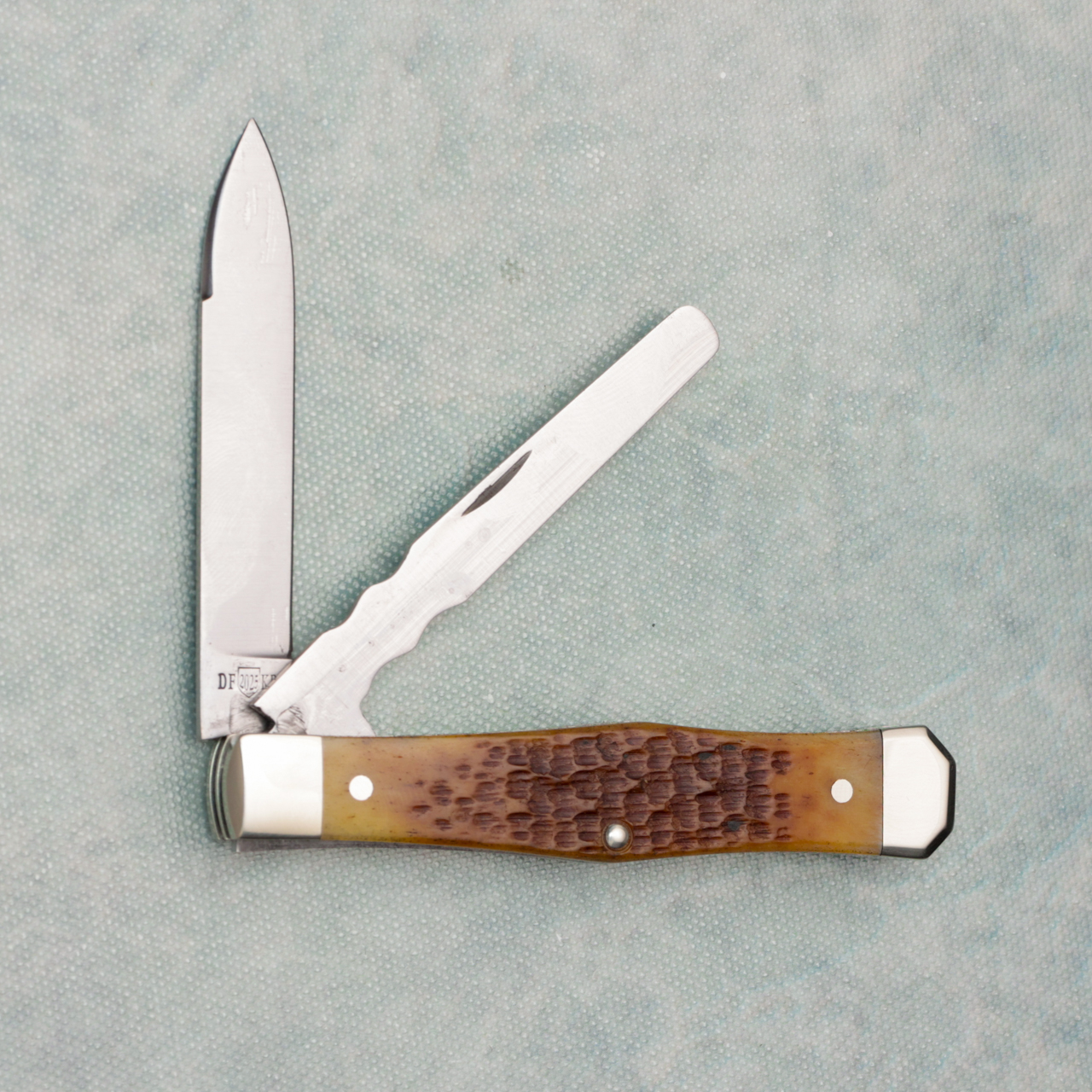 The Mortician has 2 blades in 1095 high carbon steel. The handle is iron furnace bone. A Daniels Family Knife Brand. New in tube.