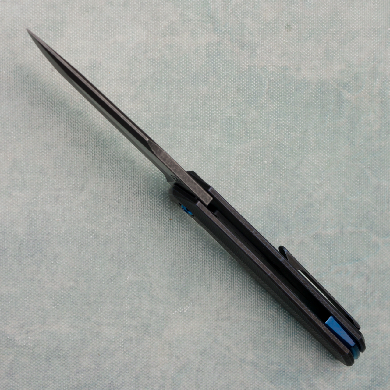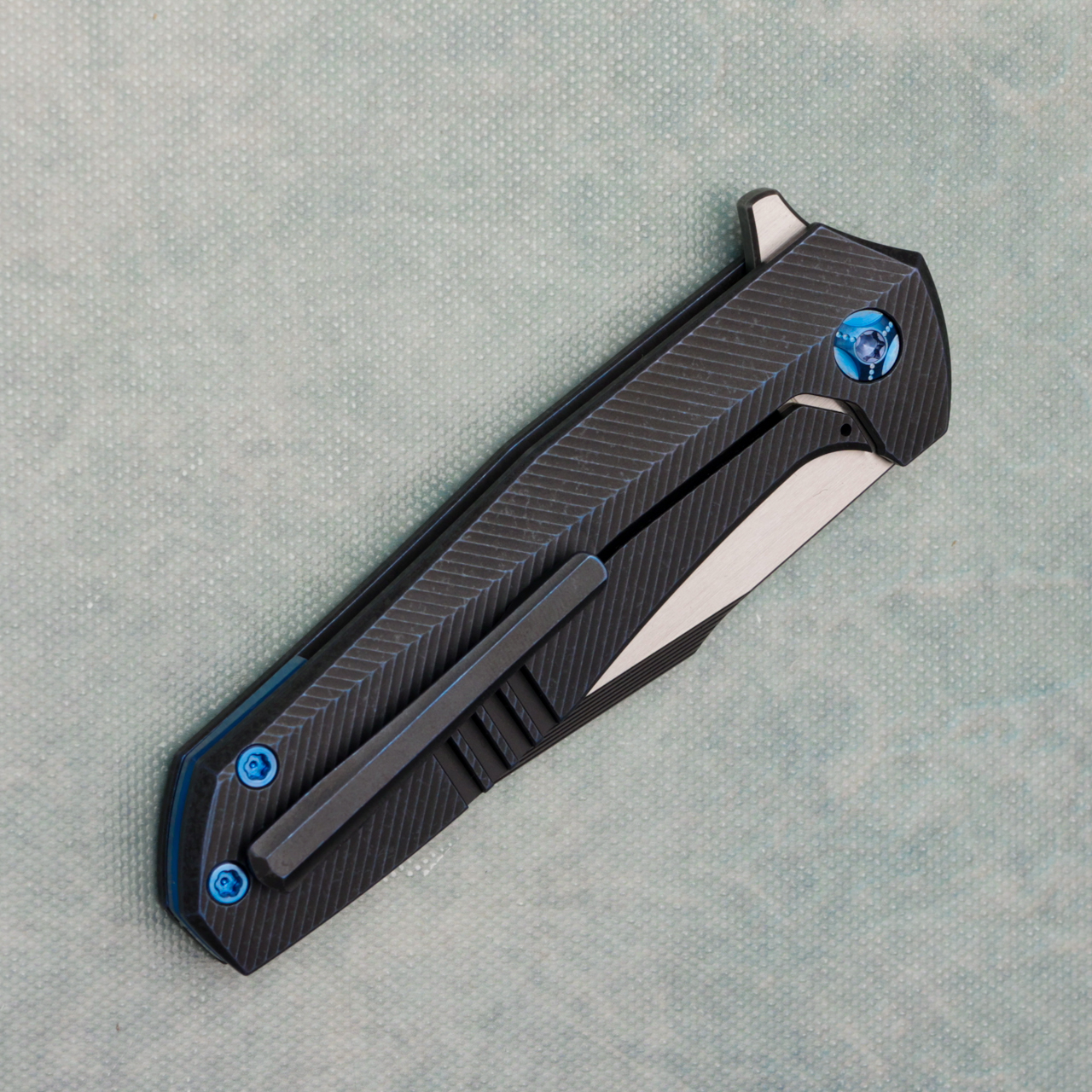 This model features black/blue 3d zipper chevron contour titanium handles, blue accents. Milled S45VN harpoon blade. New in pouch.