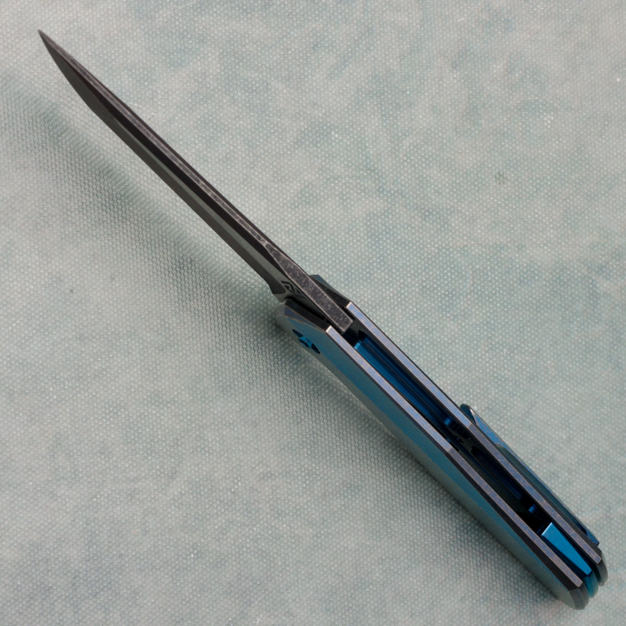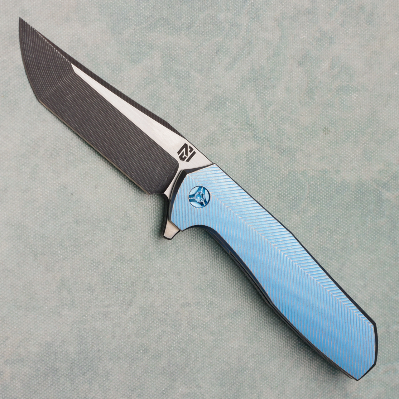 This model features cracked ice 3D Zipper/Chevron contour titanium handles. Blue accents, and acid wash S45VN milled bowie blade with satin flats. New in pouch.