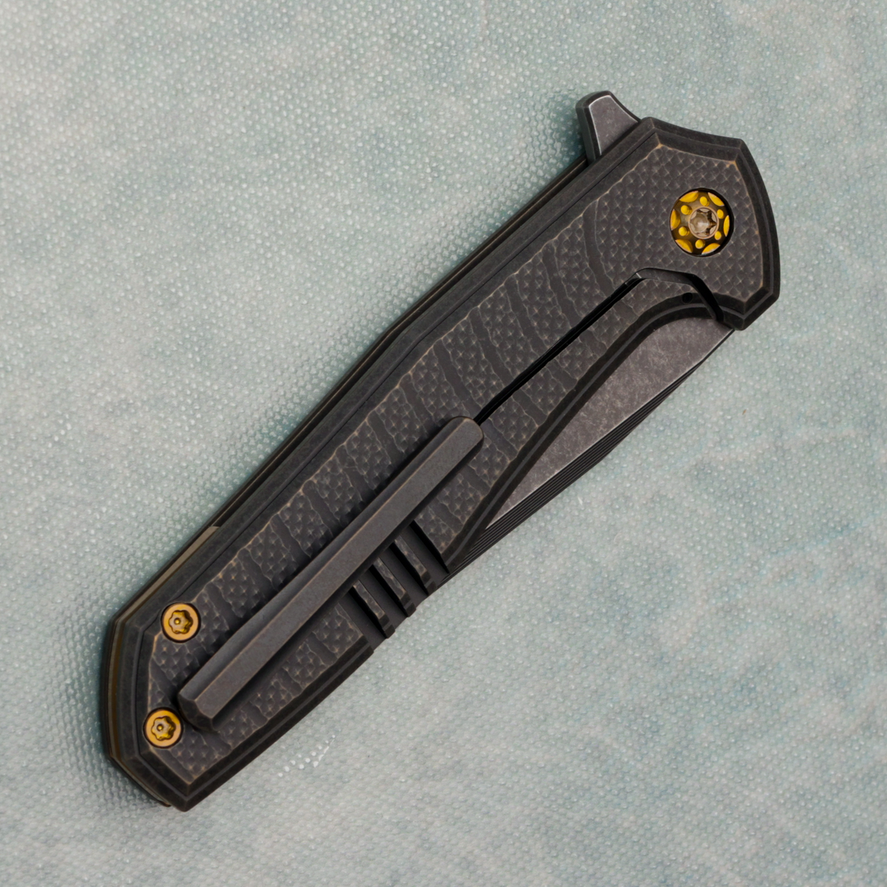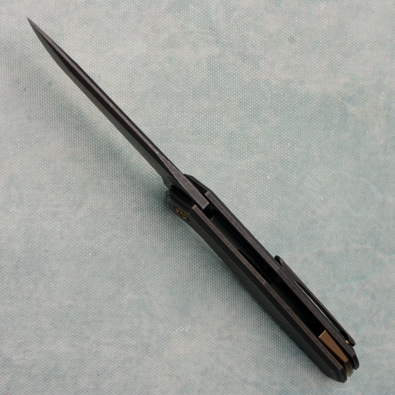 This model features echo grid pattern titanium handles with black/bronze anodizing. Milled S45VN acid wash clip point blade. New in pouch.