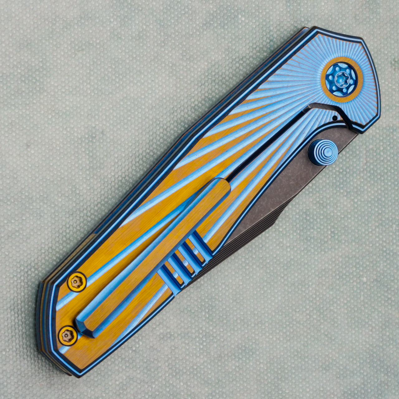 This model features blue cracked ice satin flats bronze solar custom titanium handles, blue accents. Milled S45VN harpoon blade. New in pouch.