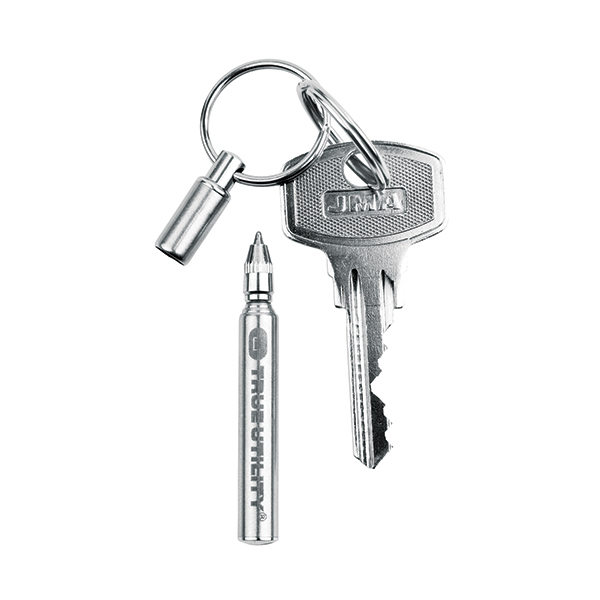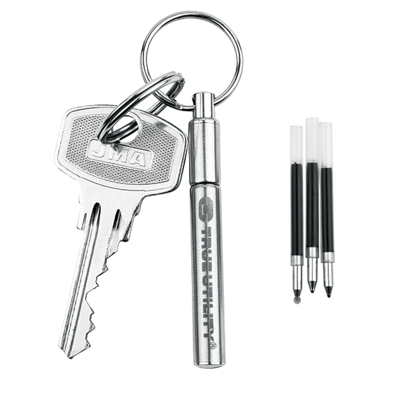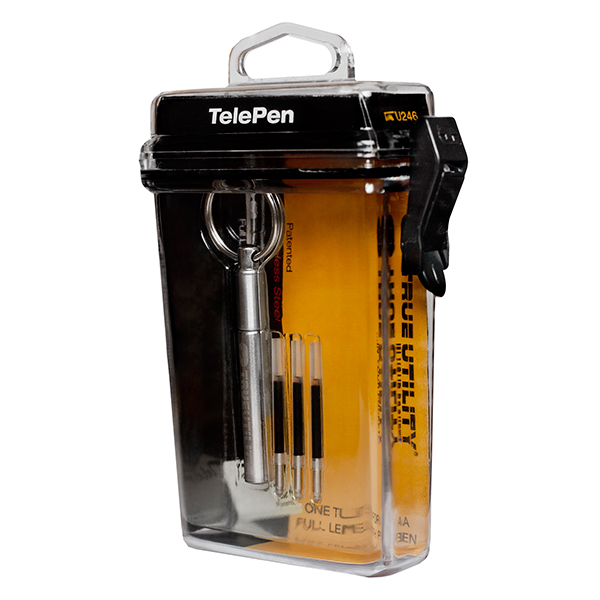 Now that’s something to write home about! Engineered in Stainless Steel and measuring only 2”, the TelePen extends telescopically to 4.5”. With just one quick pull, it instantly extends and is ready to use. Supplied complete with 3 extra black ink refills. Hangs on key ring. Packaged in a reusable, clear, weatherproof case to use with your phone, keys, cash, or other valuables.