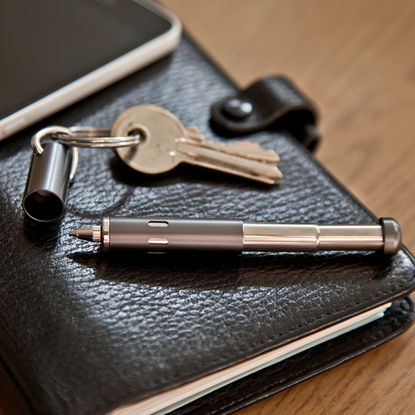 All of the TelePen essentials plus a magnetic cap…now that’s something to write home about. It includes the following design features a ballpoint pen, telescopic design, magnetic cap, v-clip key ring attachment. Brushed stainless steel tubing and anodized aircraft grade aluminum body. 3 black ink refills included and it is packaged in a watertight reusable case.