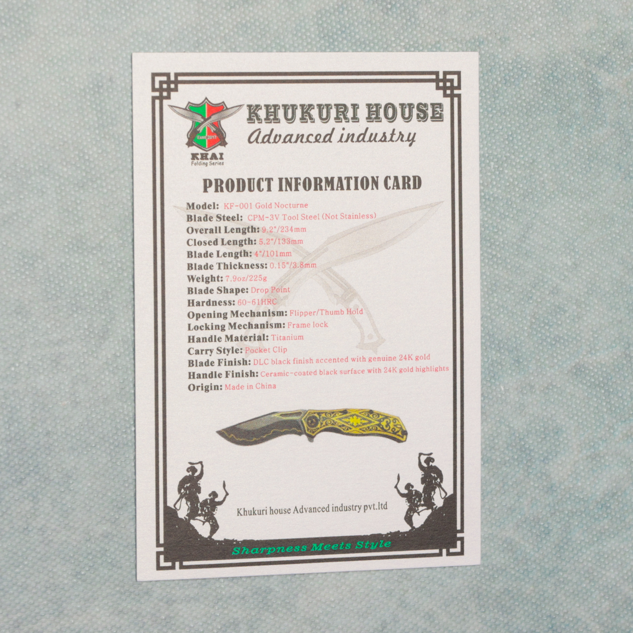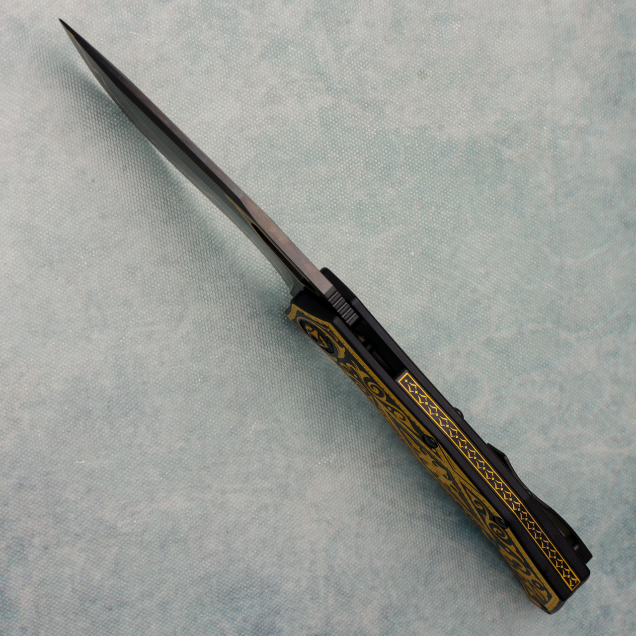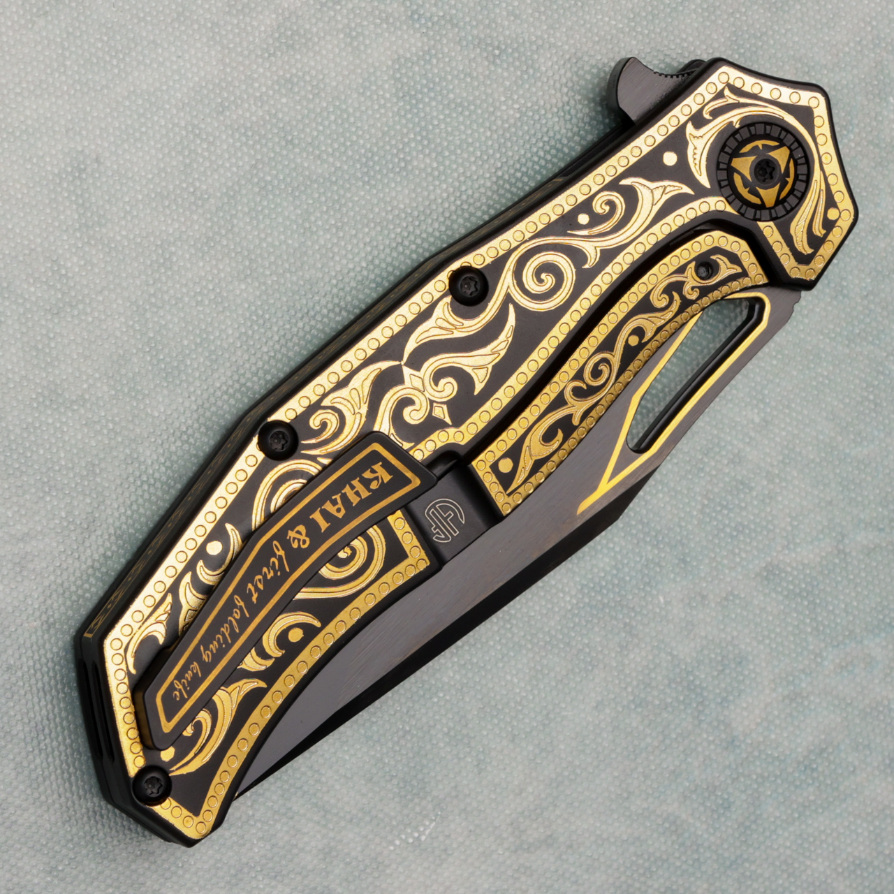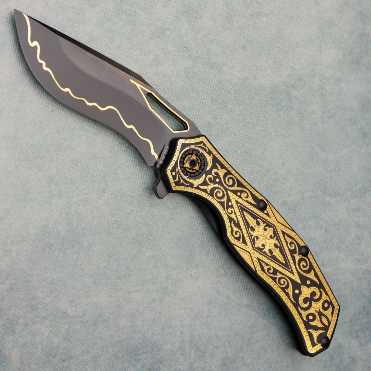 Equipped with a CPM 3V steel blade and DLC black coating, it delivers extreme durability, corrosion resistance, and a deep, obsidian sheen that contrasts perfectly with the gold reliefs. The action runs on ceramic bearings, ensuring a silky-smooth, effortless deployment every time. A titanium rear clip completes the design — elegant, functional, timeless. Brand new in box.
