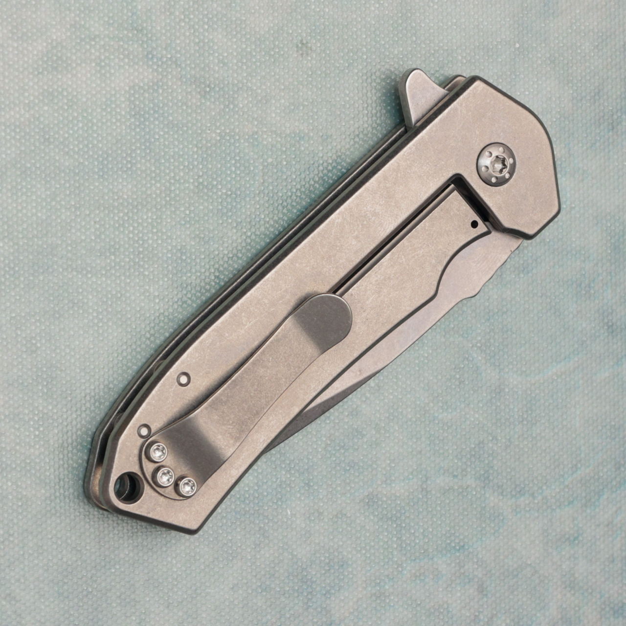 This model features honey badger blackened tumbled titanium handles. CPM-154 stonewash clip point blade. Has flipper tab for deployment. New in box.