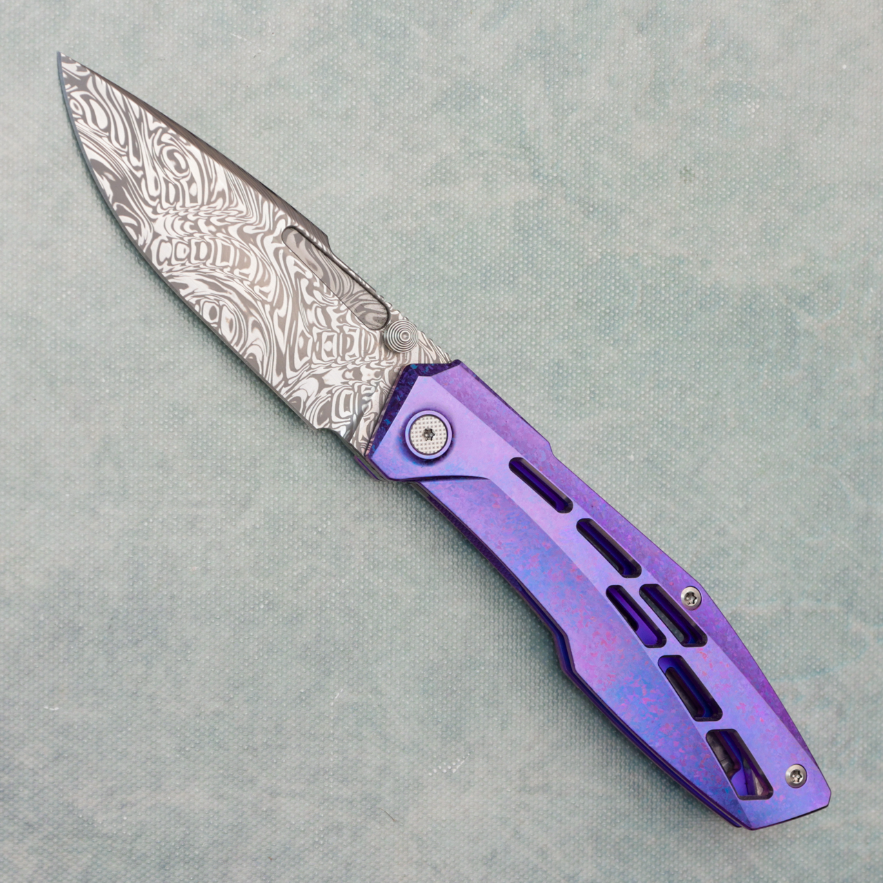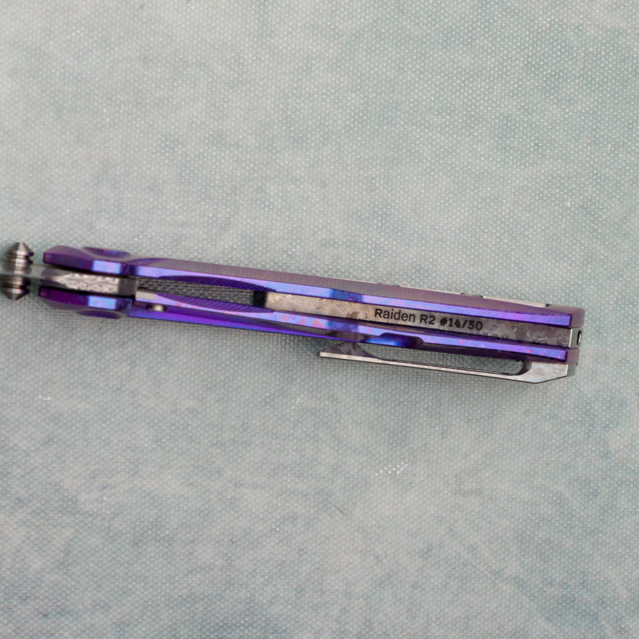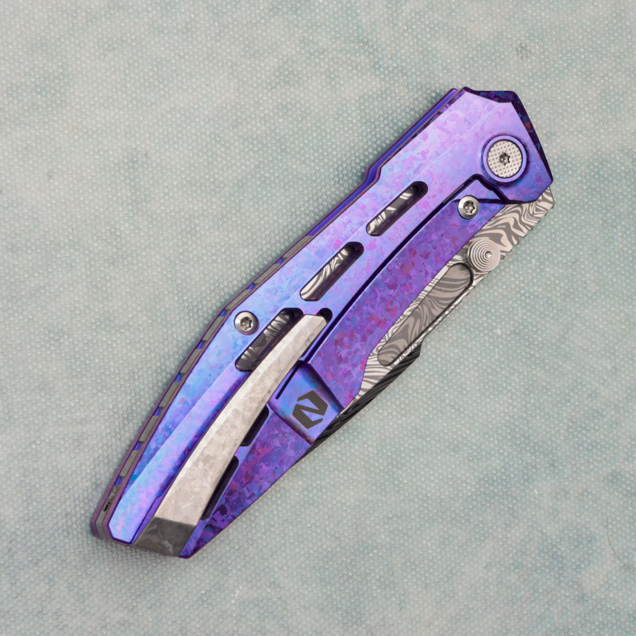 I've been eager to work with this material for a while, and I’m beyond excited to introduce it on the Raiden R2! The crystalized Ti creates a stunning iridescent glow, and the blurple ano takes it to the next level. Grabak is a newer Damasteel pattern that quickly won us over—there’s a beautiful chaos to it that pairs perfectly with the R2.