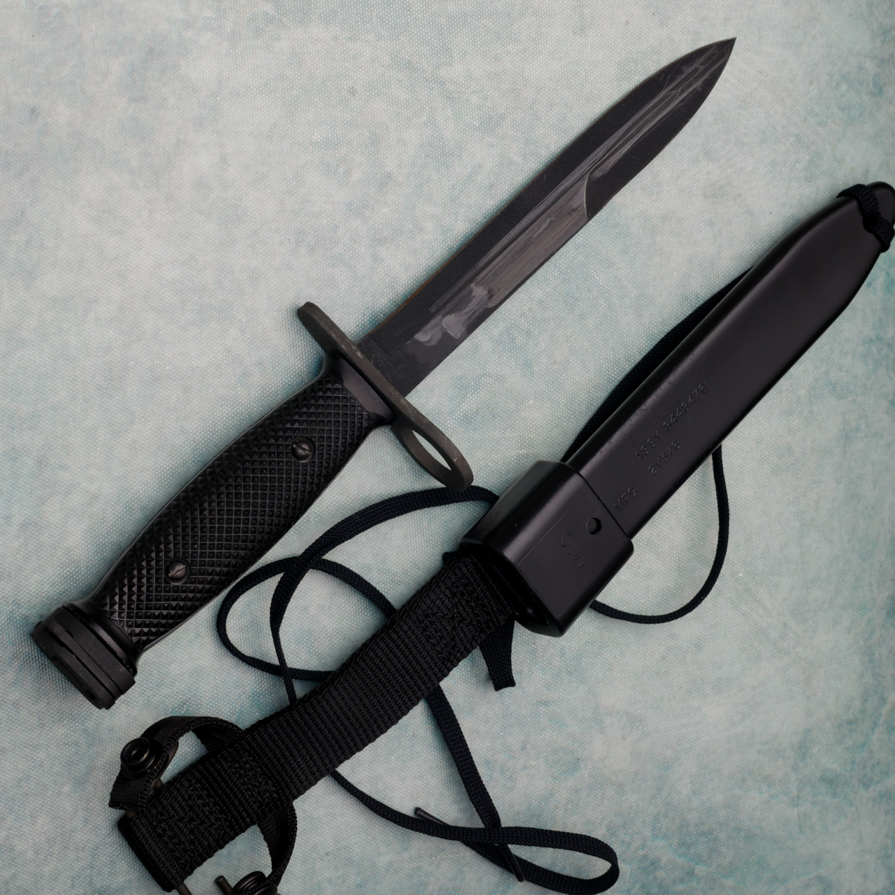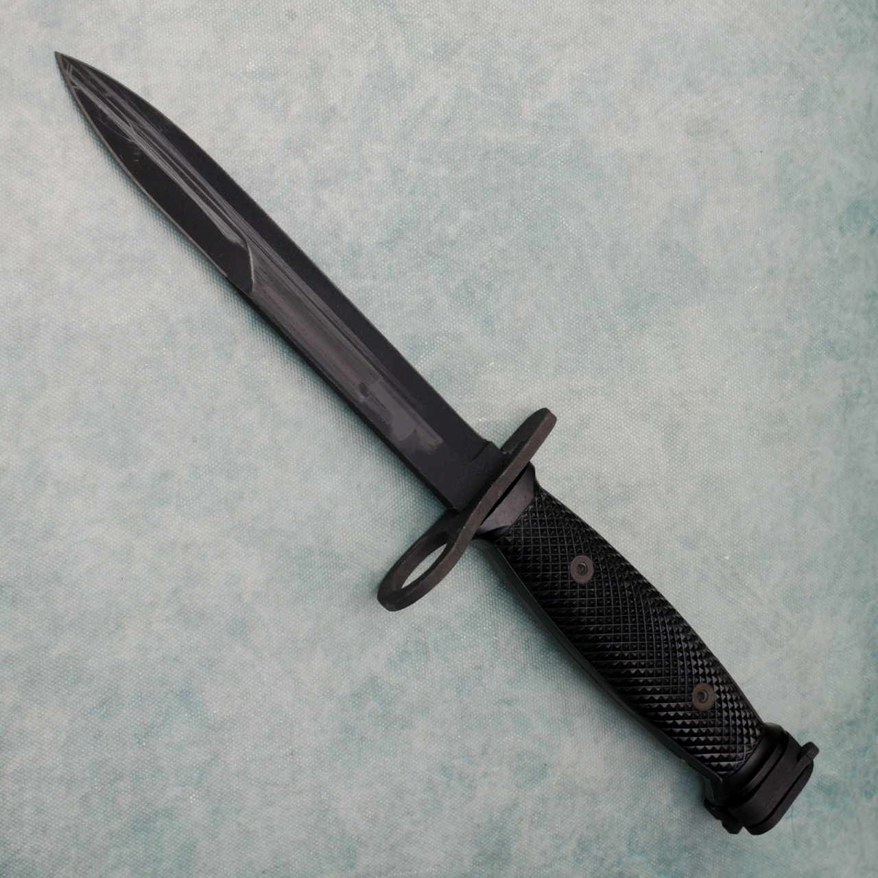 The Ontario M7 Black Bayonet Knife adds to Ontario Knife Company's legacy of deployed combat knives. You know this knife means business with one look at the 1080 Carbon Steel Spear Point Blade. The handle is made of Black Polypropylene for a strong yet lightweight feel. The sheath is made of Black Molded Plastic. Proudly made in the USA. Blade has quite a bit of wear from sliding in and out of sheath, comes in box.