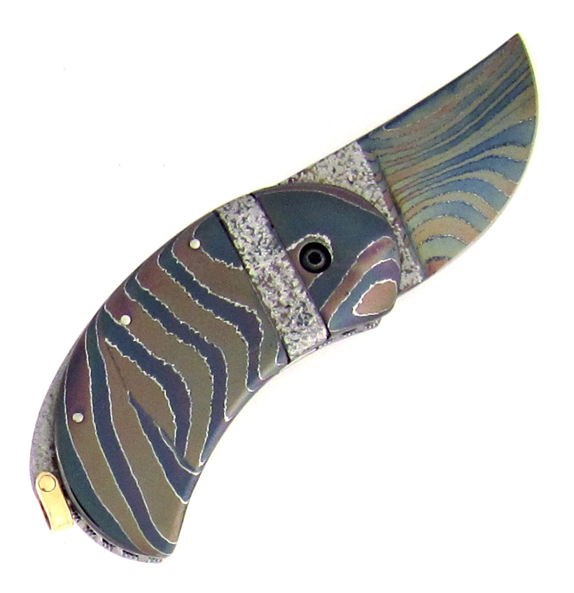 Beautiful wave pattern damascus handle scales with a blued finish and a stipling texture finish in the center for contrast. Matching blued damascus blade with stipling texture at the base. Matching blued damascus spine with stipling texture. The spine is raised at the tail end and has a 24k gold bail. Beautifully file worked titanium liners stamped BOOTH on the inside. 24k gold push button automatic knife. Wow! A genuine work of art by Phillip Booth. This is one Philip made awhile back and we got out of a collection. Awesome looking with the blued damascus. Comes mint in black zip up pouch.