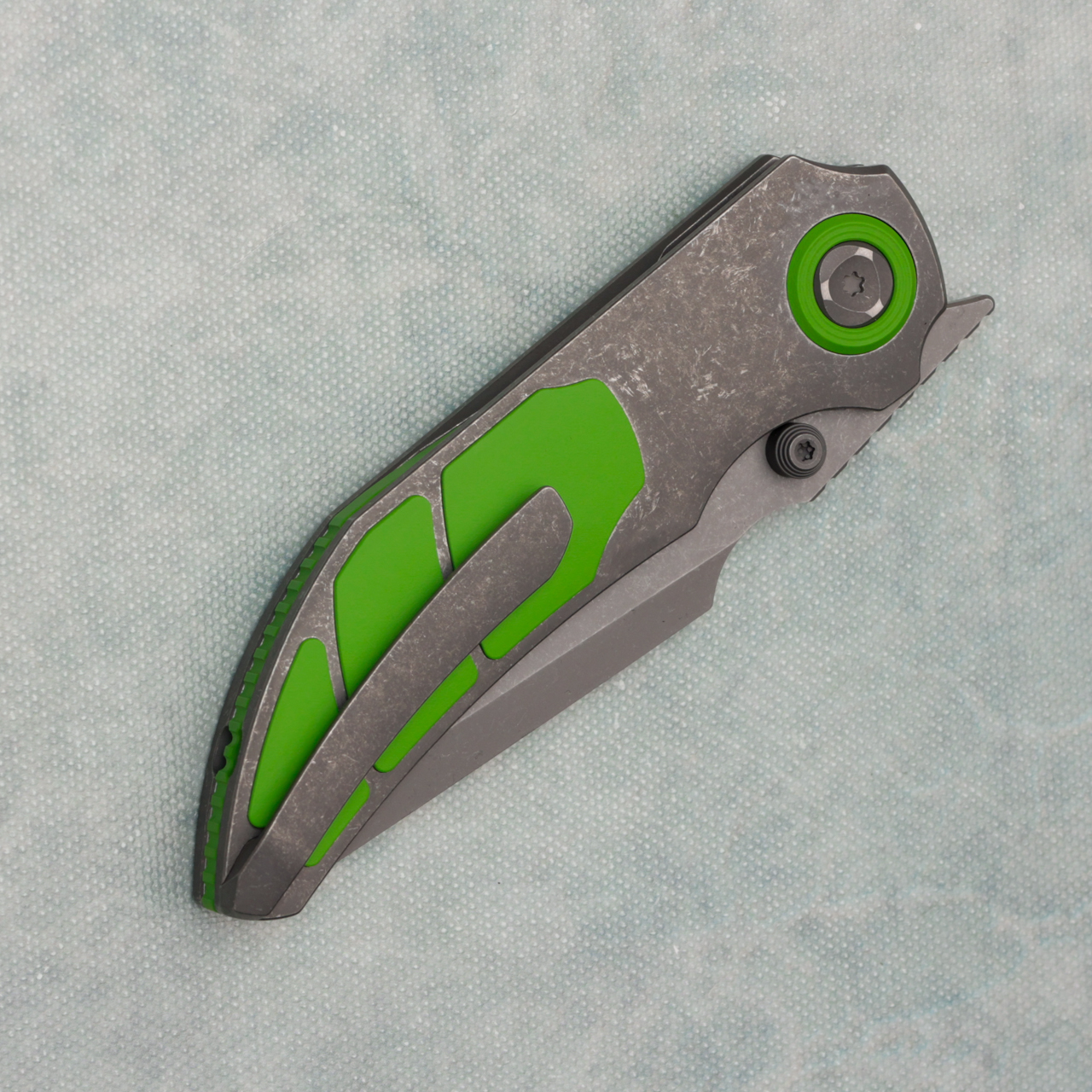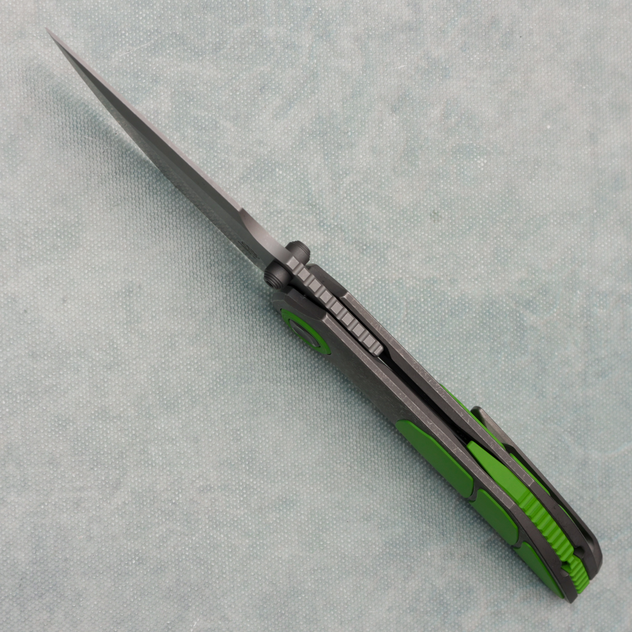 This model features a dark stonewash blade with standard cutting edge, dark titanium handles with 3 piece green cerakote titanium inlays. Very good action. Comes brand new in pouch.