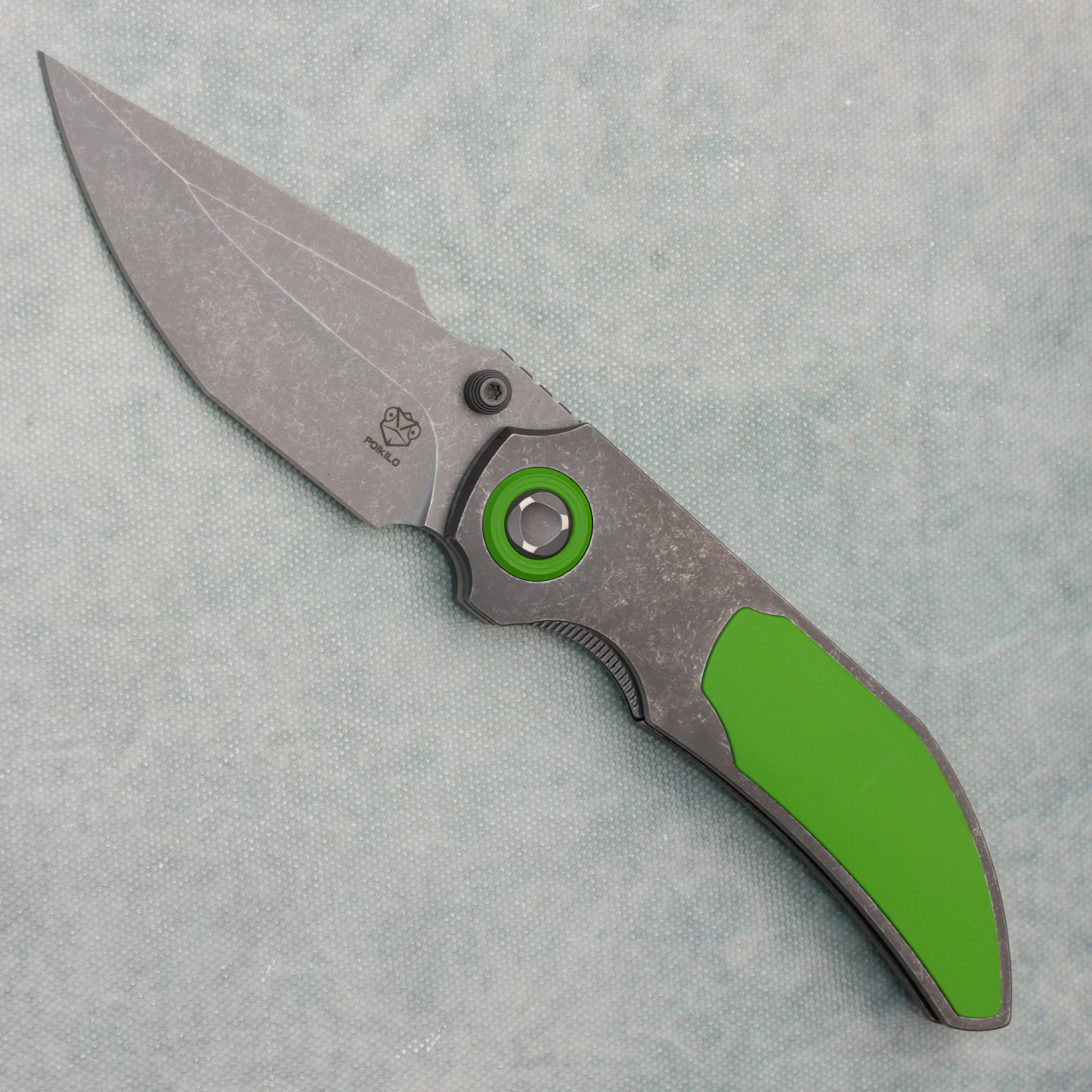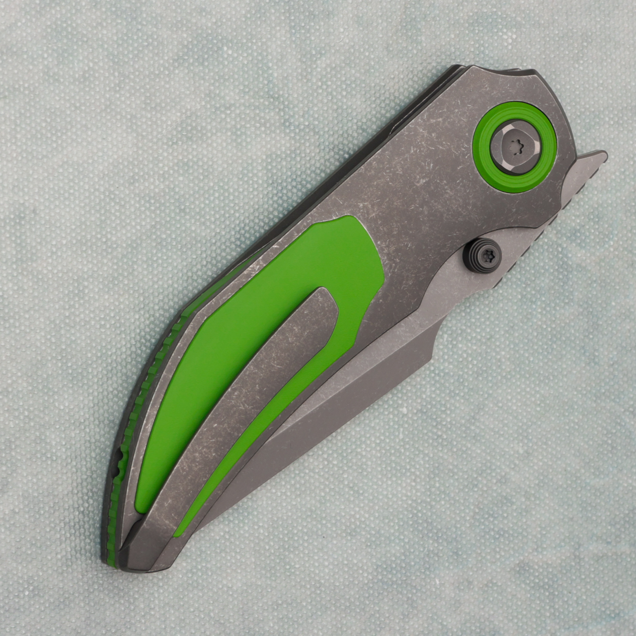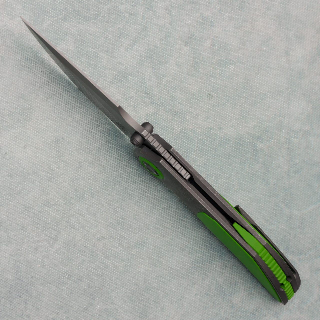 This model features a dark stonewash blade with standard cutting edge, dark titanium handles with green cerakote titanium inlays. Very good action. Comes brand new in pouch.