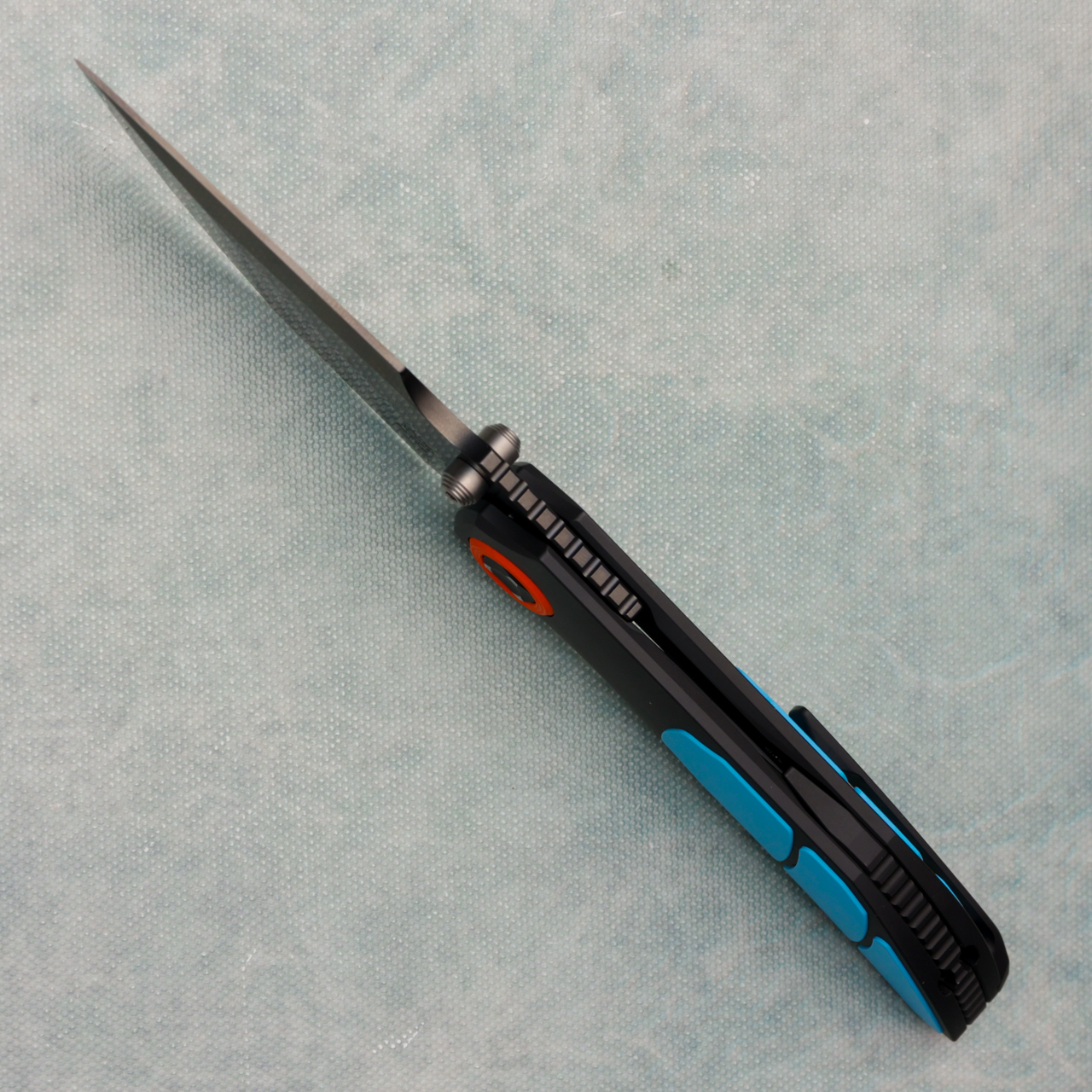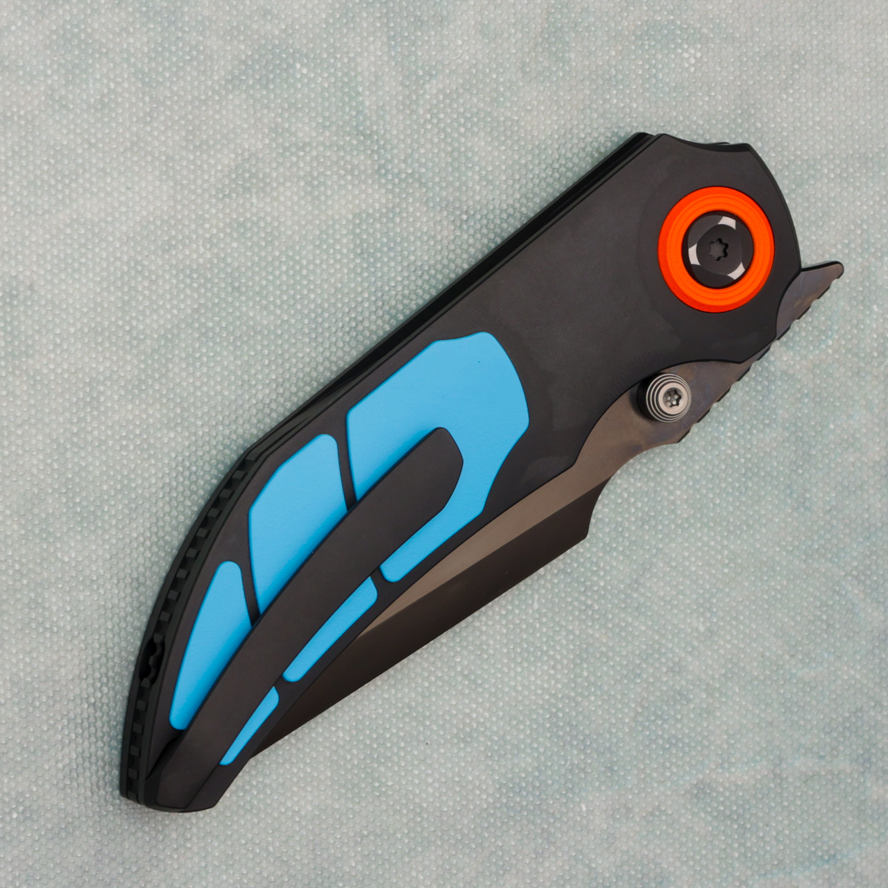 This model features a DLC blade with standard cutting edge, DLC titanium handles with 3 piece Teal cerakote titanium inlays. Very good action. Comes brand new in pouch.