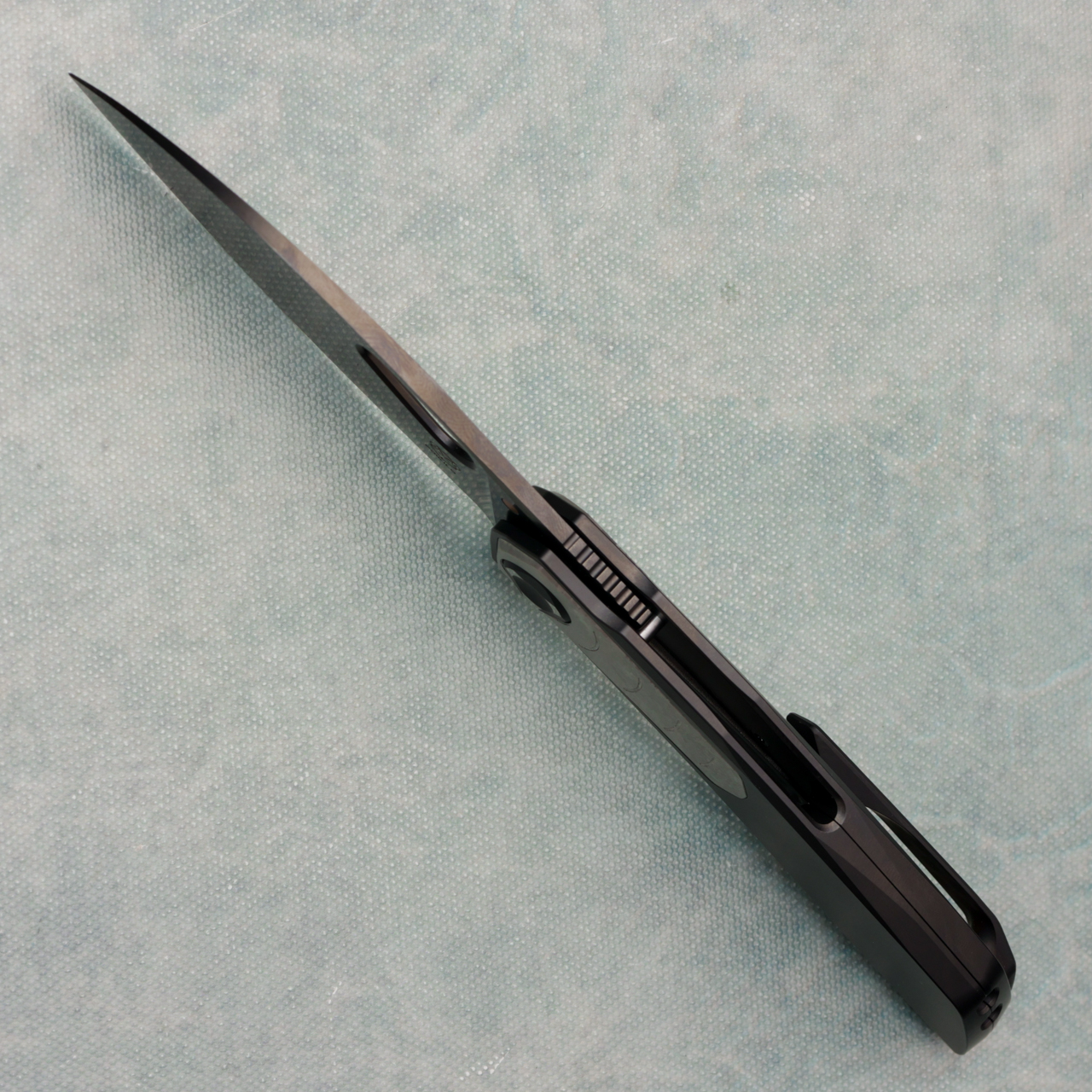 This model features a DLC pearlescent stonewash blade with standard cutting edge, DLC titanium handles with crystalized titanium inlays. Very good action. Comes brand new in pouch.