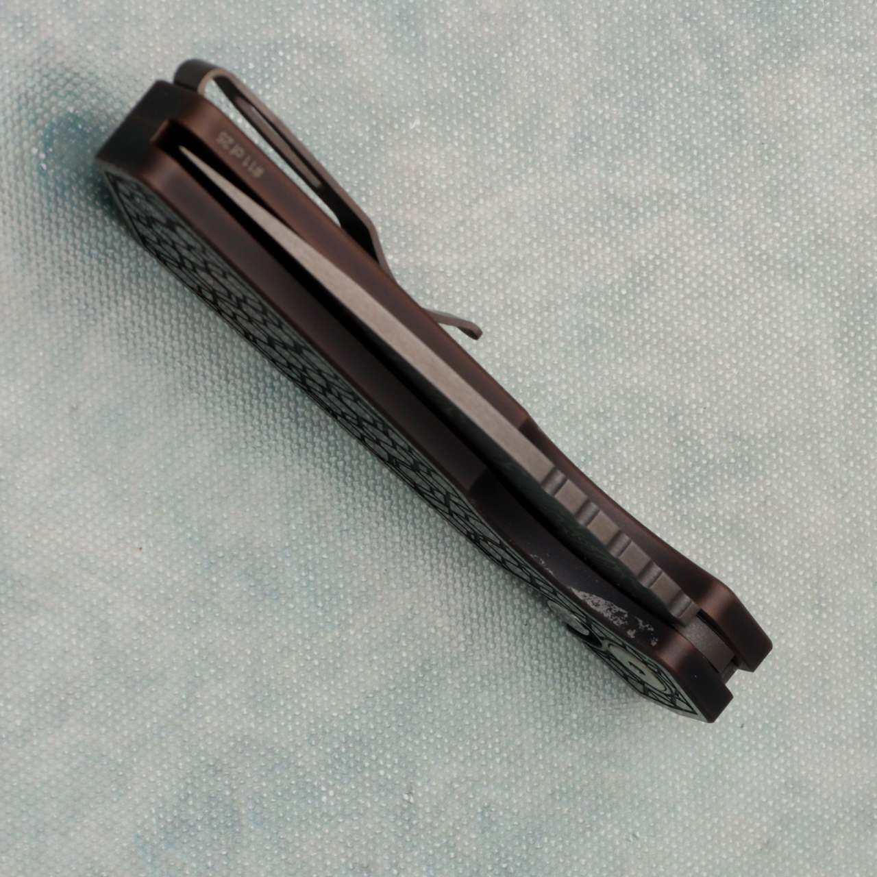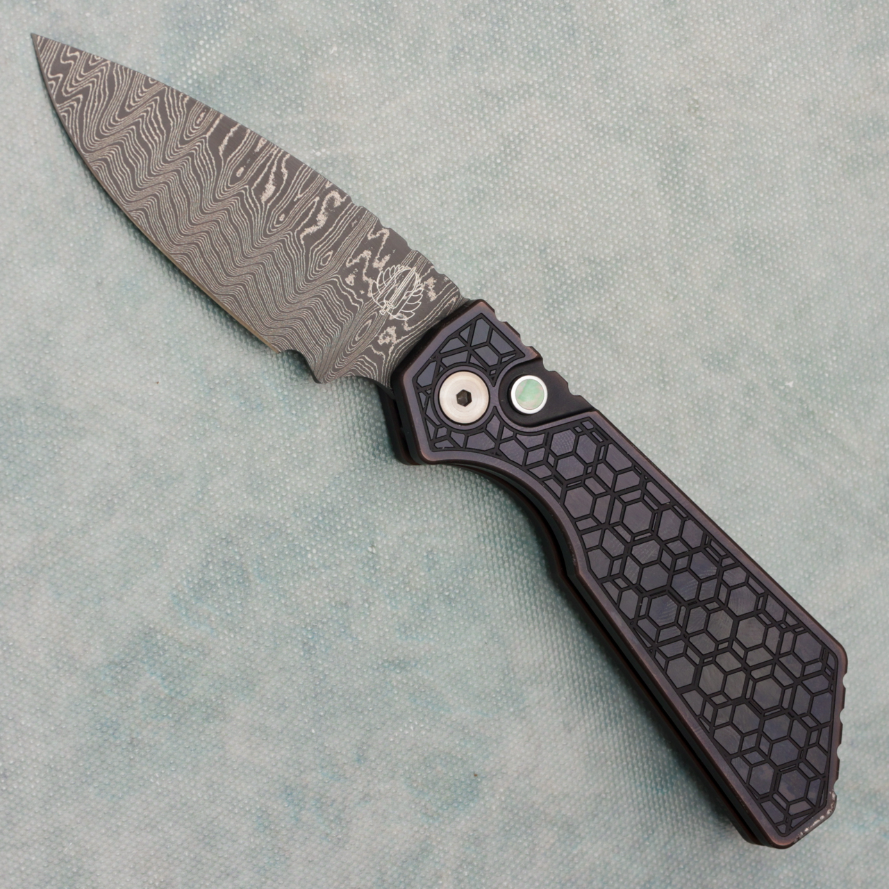 This model features "Antique" PVD 17-4 steel handle scales. Nichols Damascus drop point blade. Mother of Pearl button and a titanium pocket clip. Has a blemish on the bottom of the front scale, as well as on the side of the front and back, in box.