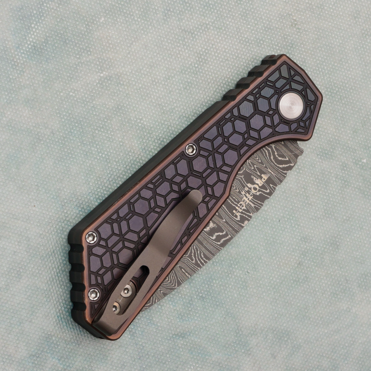 Pro-Tech 2023 Strider PT+ 007 Auto Antique PVD 17-4 Steel Handle Nichols Damascus Blade MOP Button (Pre-owned)