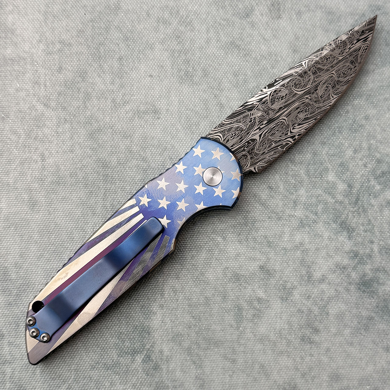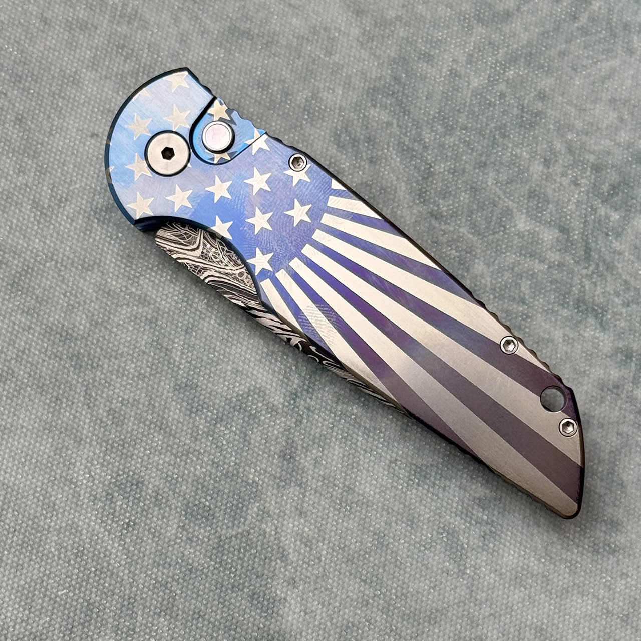 Pro-Tech 2023 TR-3 Custom 006 Patriotic Anodized Titanium Handle Eggerling Carbon Mosaic Damascus Blade Pearl Button (Consignment)