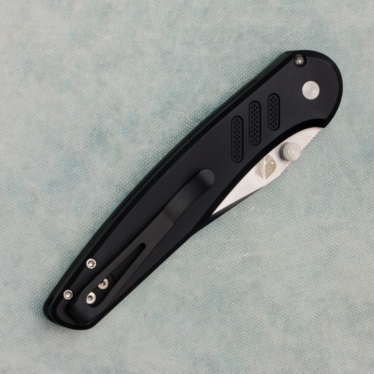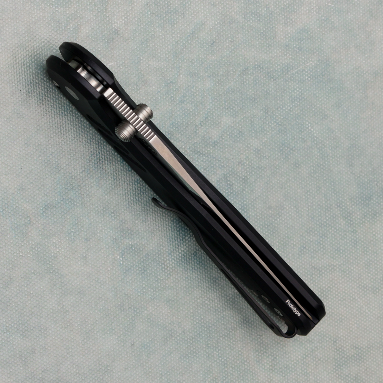 This model features knurled black anodized 7075 aluminum handle scales. Mike Irie mirror polished 154CM blade. Satin hardware, and pearl button, and black DLC finished pocket clip for tip up carry. Marked prototype. Brand new in box.