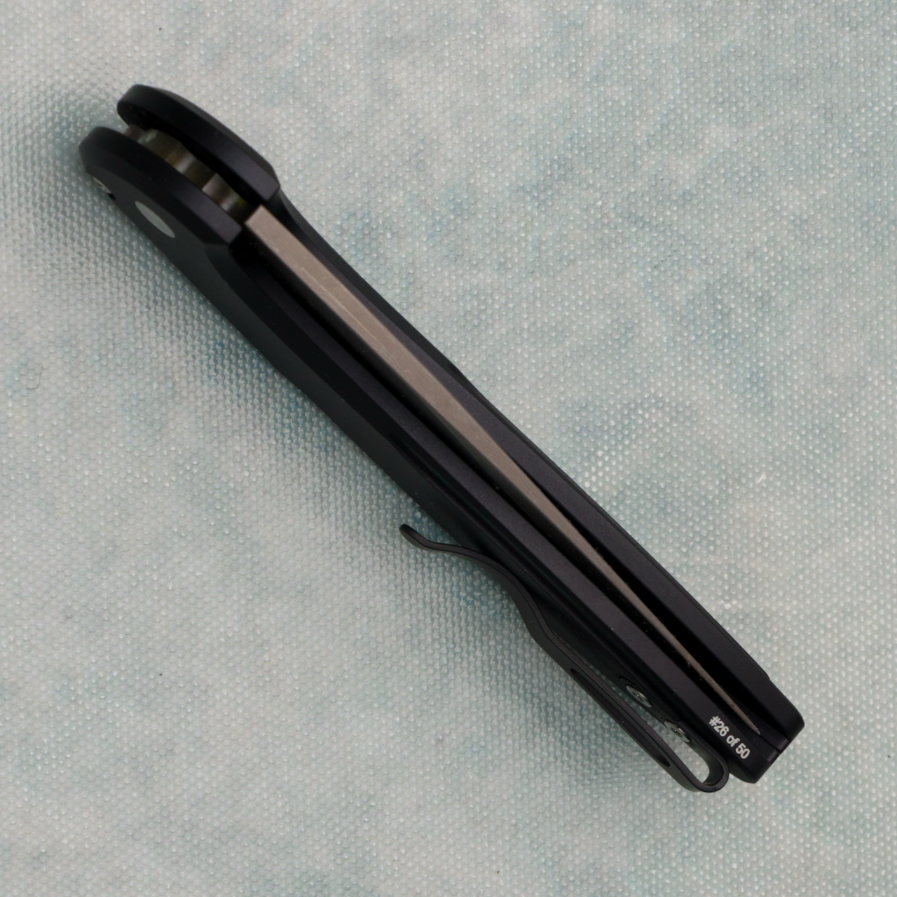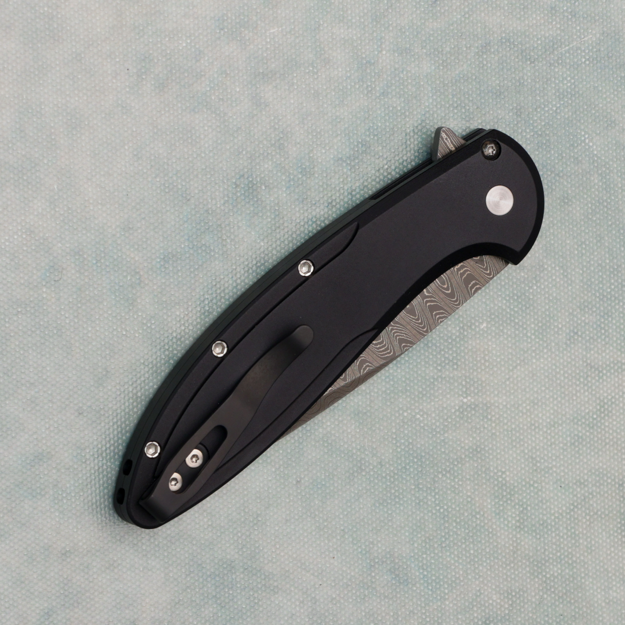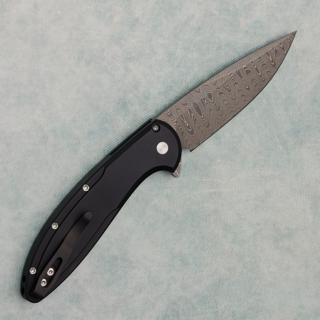 This Cambria 2 model features black aluminum handle scales with a maple burl inlay. Chad Nichols ladder Damascus drop point blade. Mosaic pin button, and black deep carry pocket clip. Number 26 of 50. Like new in box.