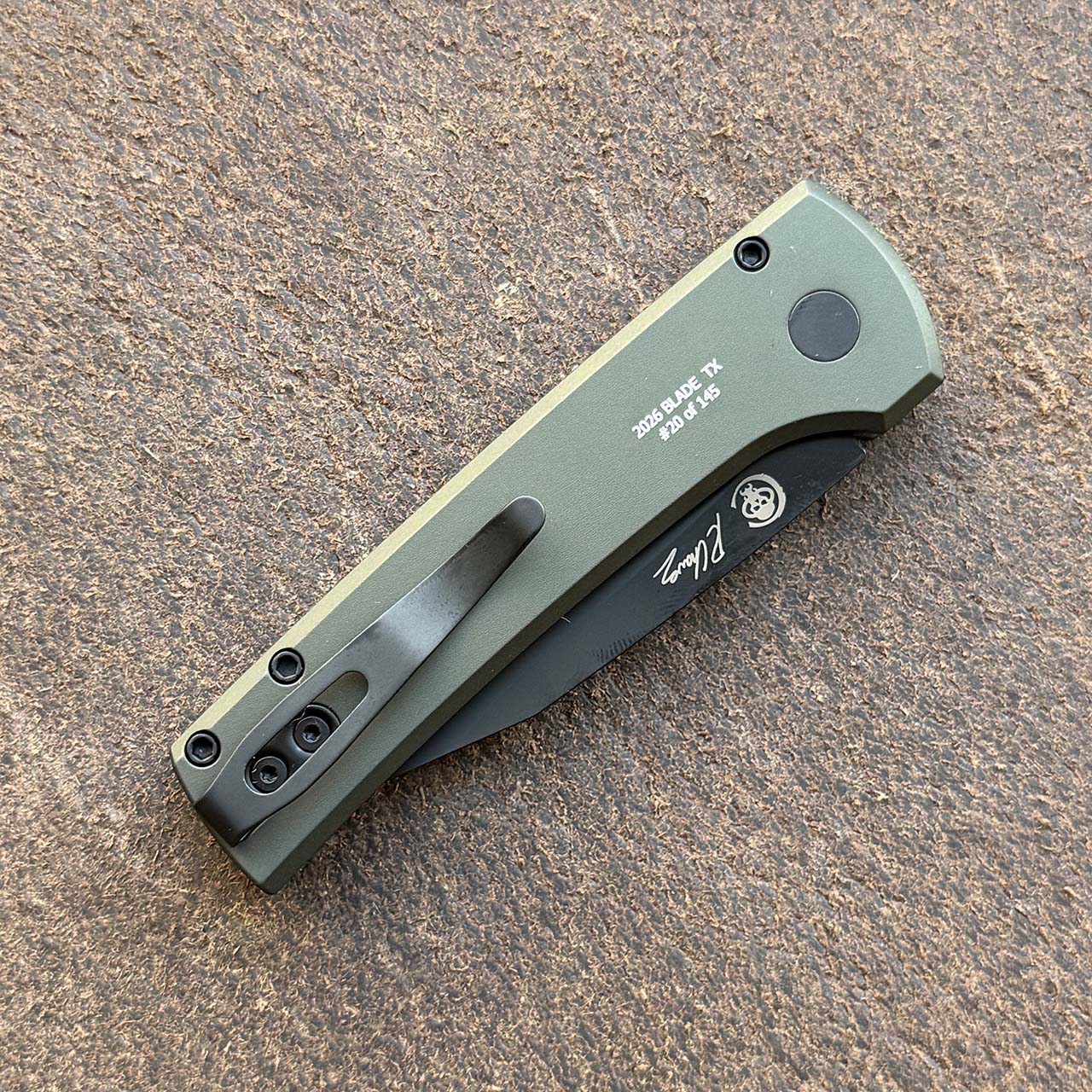 This collaboration between Pro-Tech and Chaves does not disappoint, green aluminum handles with DLC MagnaMax blade. Black deep carry pocket clip, black lip pearl button. Numbered xx of 145. Brand new in box.