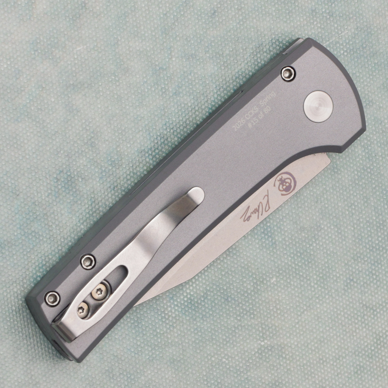 This collaboration between Pro-Tech and Chaves does not disappoint, grey aluminum handles with stonewashed MagnaMax blade. Satin deep carry pocket clip, white pearl button. Numbered xx of 80. Brand new in box.