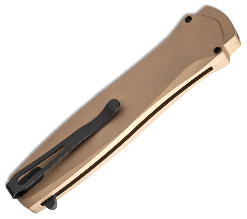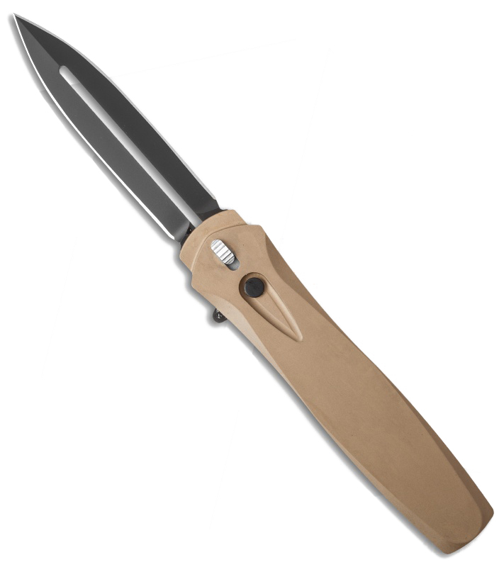 The Dark Angel from Protech is a beautiful knife with a sleek look. This single action out-the-front knife has great action that is quick and controlled. Black DLC finished double edge dagger blade. Desert sand hard anodized 6061-T6 aluminum body. The Dark Angel also features a safety for added security. Black hardware and pocket clip. Includes durable nylon sheath. The Dark Angel is a fine out the front automatic knife! Brand new in box.