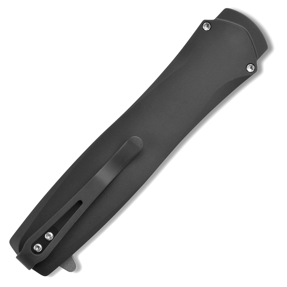 The Dark Angel is a beautiful knife with a sleek look. This single action OTF (out the front) knife has great action that is both quick and controlled. The double edge dagger blade with a long milled cut down the center. The blade is retracted via the charging knob on the side of the handle. A sliding safety is incorporated into the top of the handle for secure and easy access.