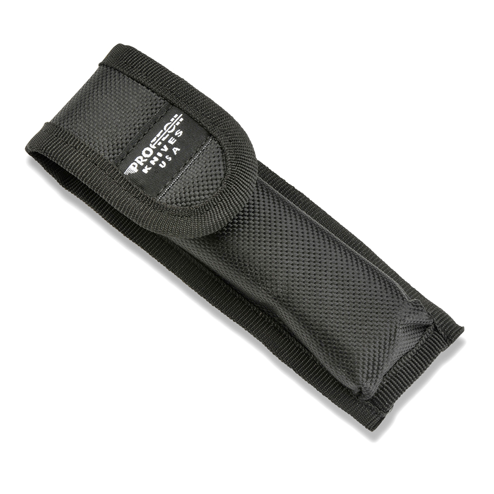 This model features a black anodized 6061-T6 frame. Satin finished 154-CM stainless steel double edge dagger blade. Satin finished hardware. Black DLC finished tip up deep carry pocket clip. The frame is etched with the Pro-Tech USA logo, model information, and serial number. Brand new in box with Pro-Tech nylon sheath.