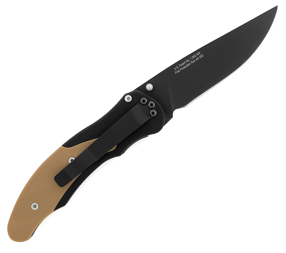 Black anodized 6061-T6 aluminum frame with coyote brown G-10 inlays. Black coated 154-CM stainless steel blade with dual thumb studs. Removable black pocket clip. This is a dual action automatic knife which means it can be opened manually or by pushing the hidden button in the tip of the G-10 inlay. Another rare Pro-Tech dual action pocket knife. Discontinued and hard to find! First production run serial number #252. Like new in box (a couple minor scratches on the pocket clip and clip screws).