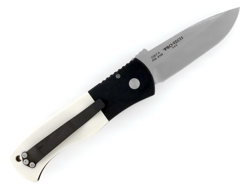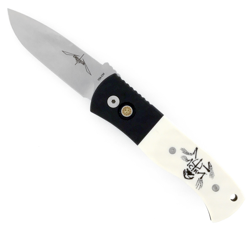 Black anodized aluminum handle with ivory micarta inlays, the front inlay is custom laser scrimshawed with the Chris Kyle Frog Foundation logo. Stonewash finished 154-CM stainless steel spear point blade. Push button activated, this knife really hits hard. Mosaic pin inlaid push button. Removable pocket clip for tip-up carry. Lanyard hole. Awesome switchblade collaboration by American made Pro-Tech knives and American made Emerson knives. New in box with Pro-Tech nylon sheath.