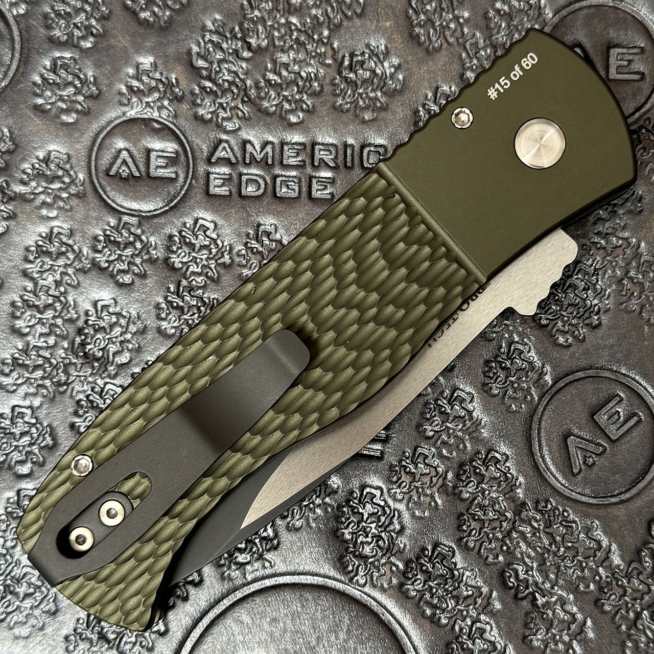 This model features jigged green aluminum frame. 2 tone DLC/satin finished CPM-20CV stainless steel flat ground spear point blade. NEW wide deep carry pocket clip. Limited edition blade show 2024 model numbered xx/60. Brand new in box.