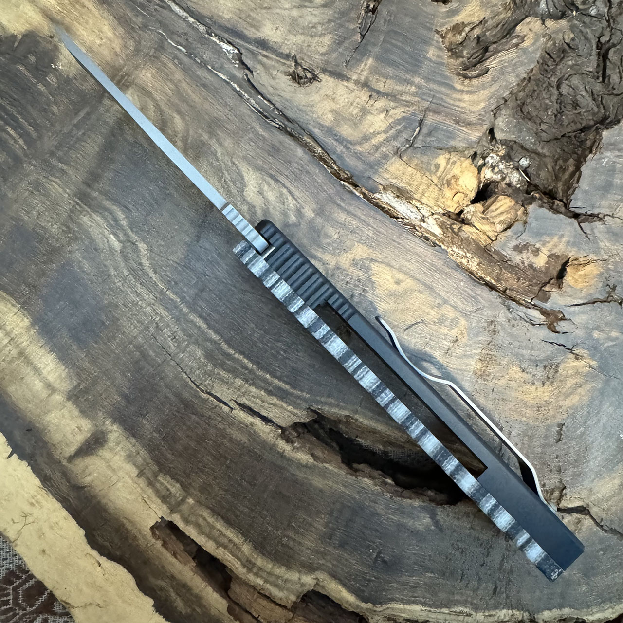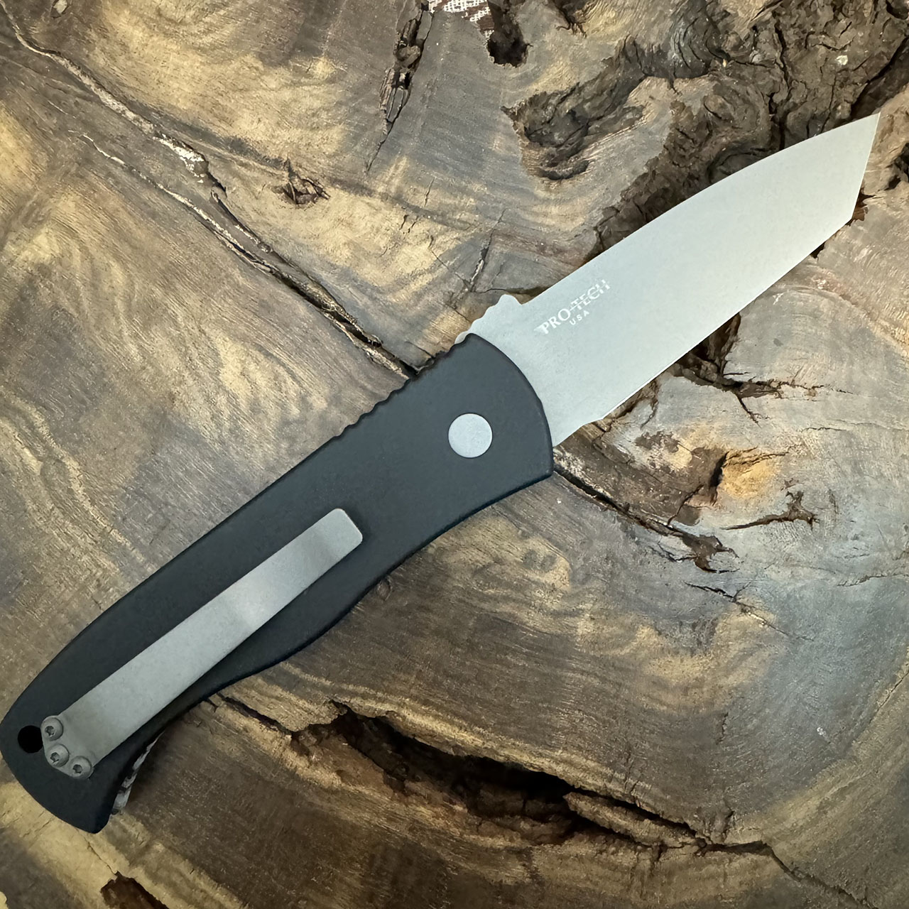 This model features black anodized 6061-T6 aluminum frame with a Gl Hansen "Denim Stripe" unique micarta top. Smoke gray finished 154-CM stainless steel chisel ground tanto blade. Smoke gray finished hardware and pocket clip for tip up carry. Mosaic inlaid push button. These unique micarta Pro-Tech's are awesome and no two are the exact same! Brand new in box.