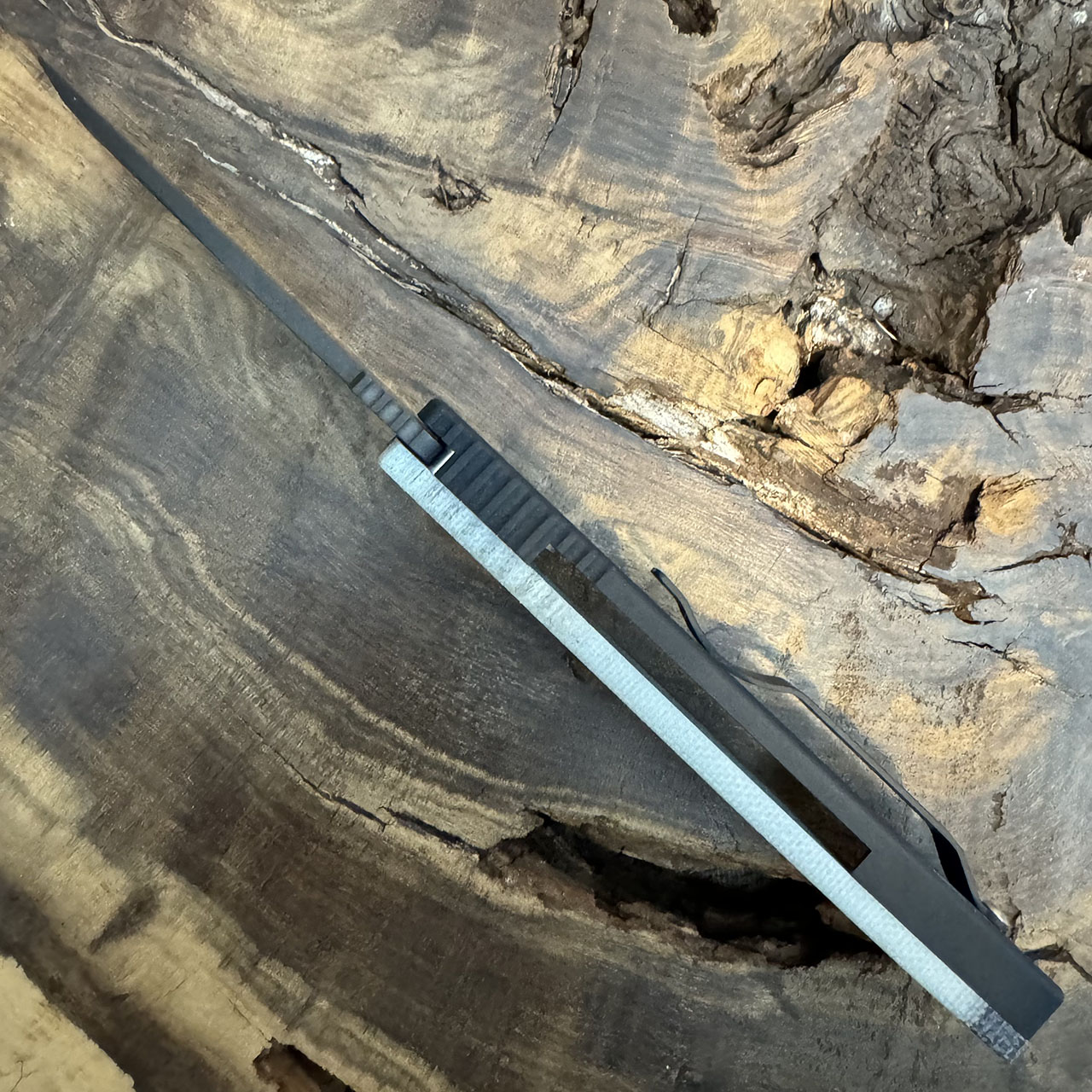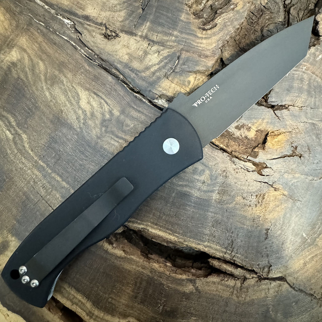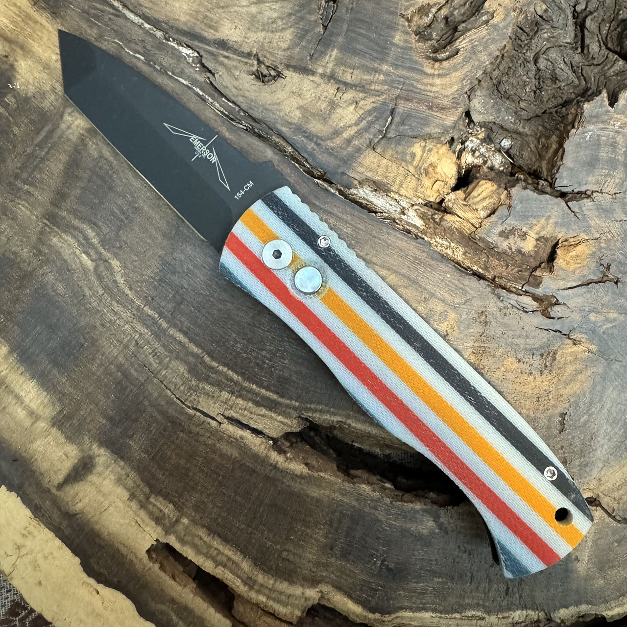 This model features black anodized 6061-T6 aluminum frame with a Gl Hansen "Hudson Blanket" unique micarta top. DLC finished 154-CM stainless steel chisel ground tanto blade. Satin finished hardware and DLC pocket clip for tip up carry. Mother of pearl push button. These unique micarta Pro-Tech's are awesome and no two are the exact same! Brand new in box.