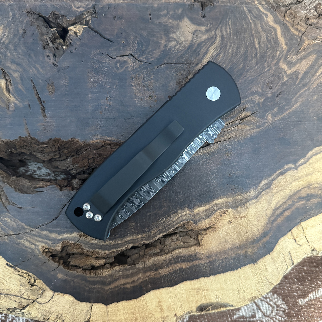 Pro-Tech Emerson CQC7 Auto Tanto Mexican Blanket Unique Micarta Top Damascus Blade Mother of Pearl Button
