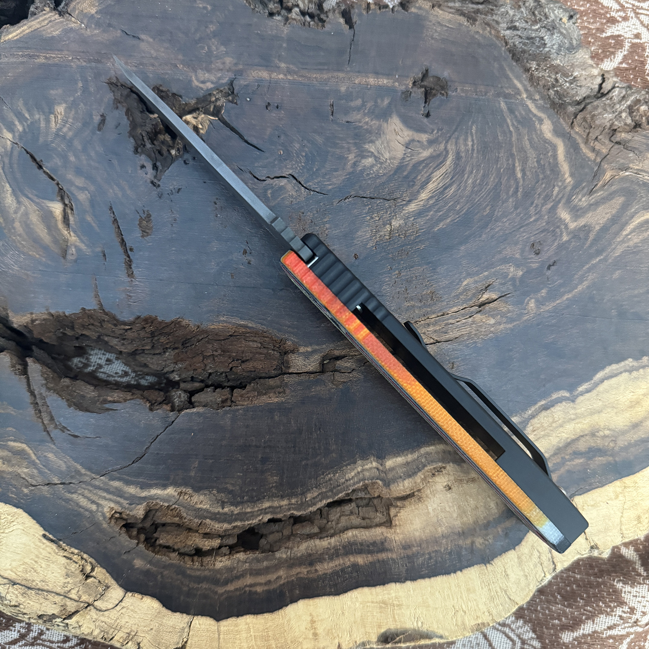 This model features black anodized 6061-T6 aluminum frame with a Mexican Blanket unique micarta top. Beautiful Damascus chisel ground tanto blade. Satin finished hardware and DLC pocket clip for tip up carry. Mother of Pearl inlaid push button. These unique micarta Pro-Tech's are awesome and no two are the exact same! Brand new in box.