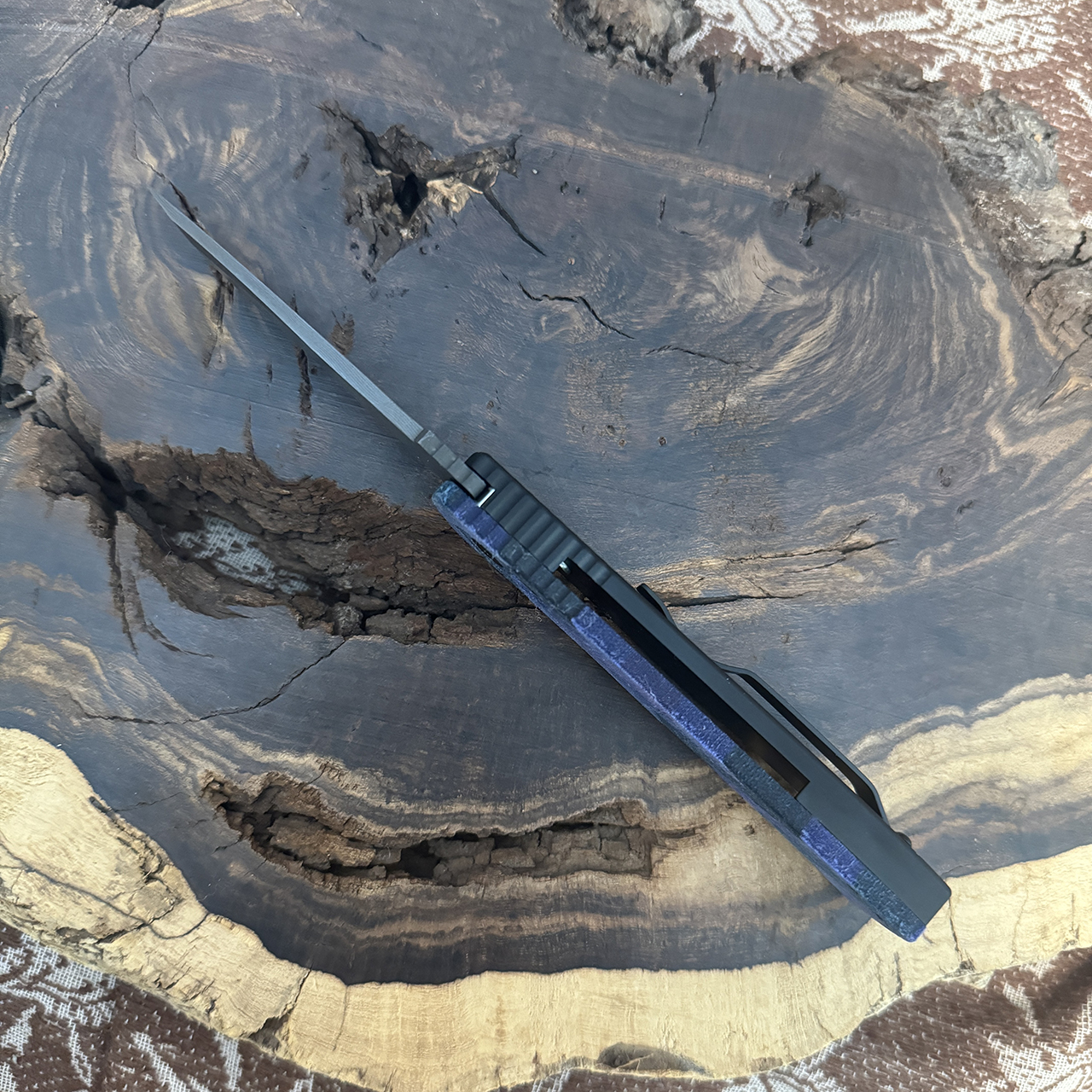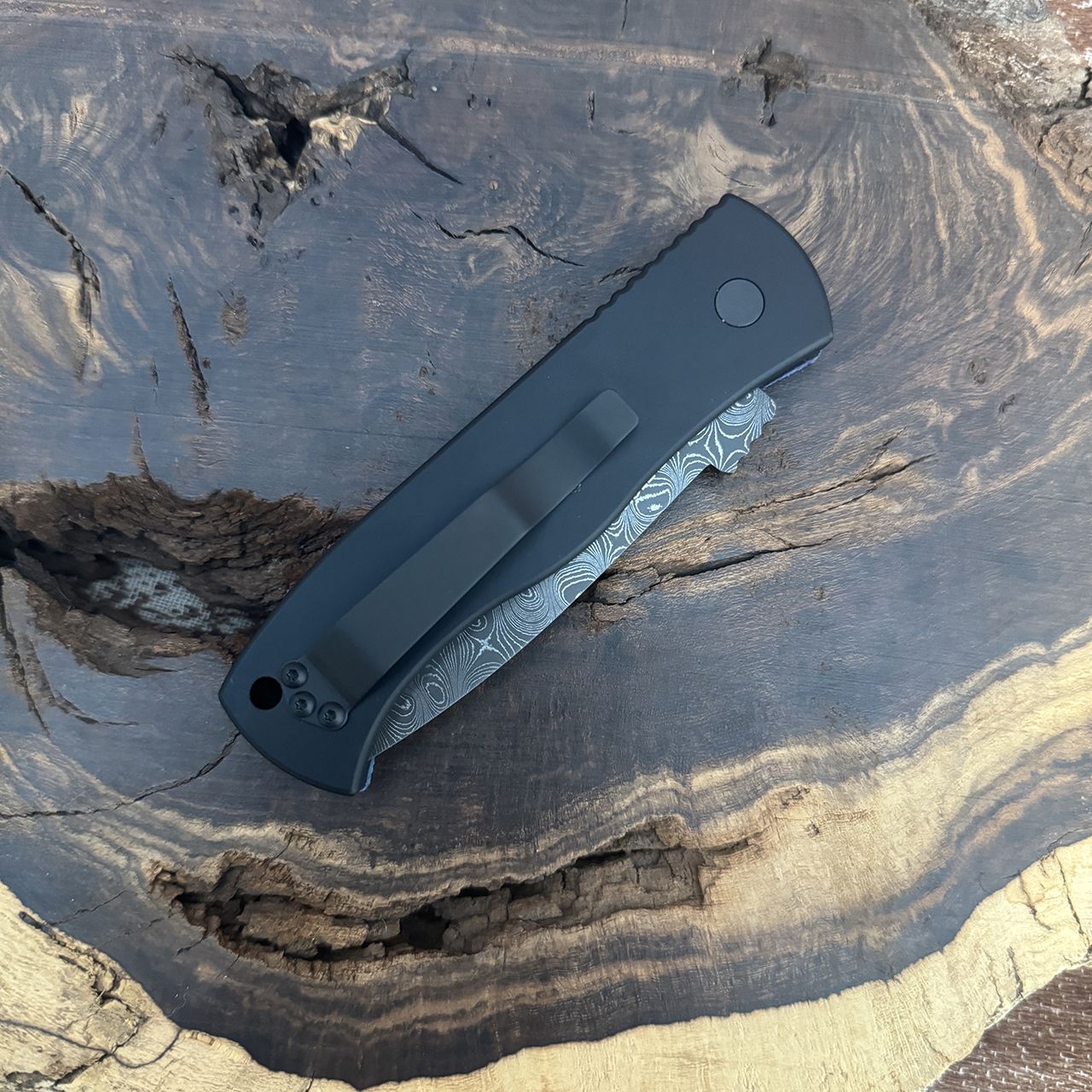 This model features black anodized 6061-T6 aluminum frame with a Purple Black Zig Zag unique micarta top. Beautiful Damascus chisel ground tanto blade. Satin finished hardware and DLC pocket clip for tip up carry. Black Lip Pearl inlaid push button. These unique micarta Pro-Tech's are awesome and no two are the exact same! Brand new in box.