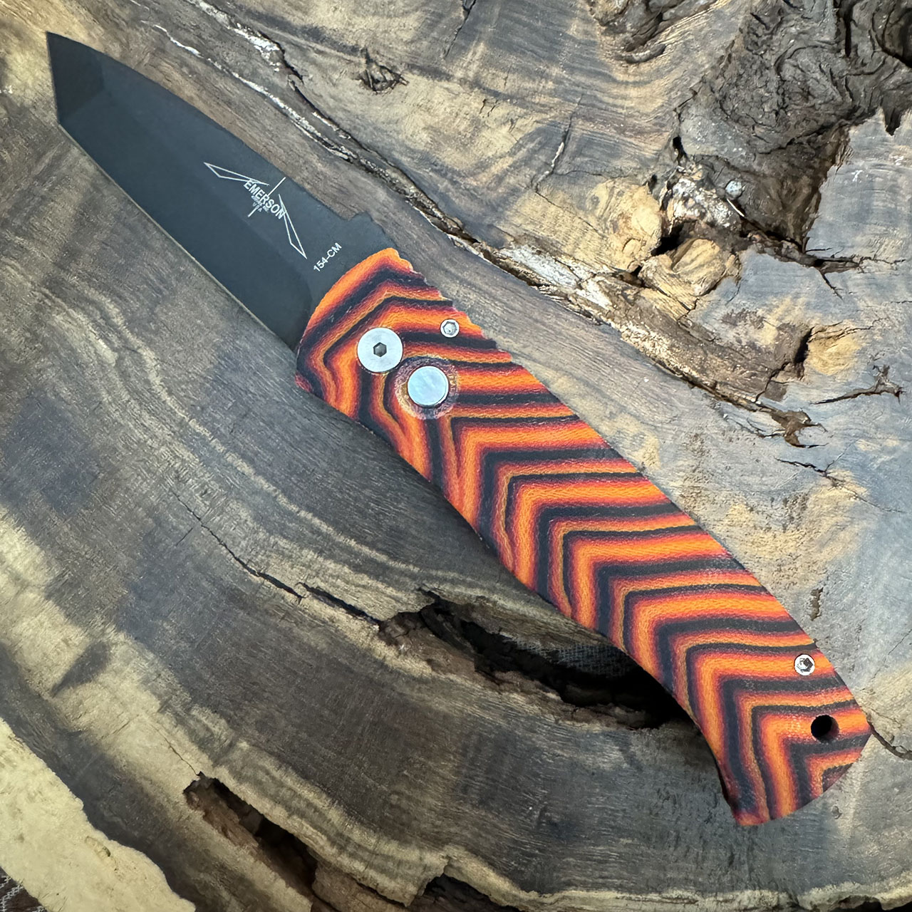 Pro-Tech Emerson CQC7 Auto Tanto Unique Micarta Orange/Black Top DLC Blade Satin Hardware Pearl Button