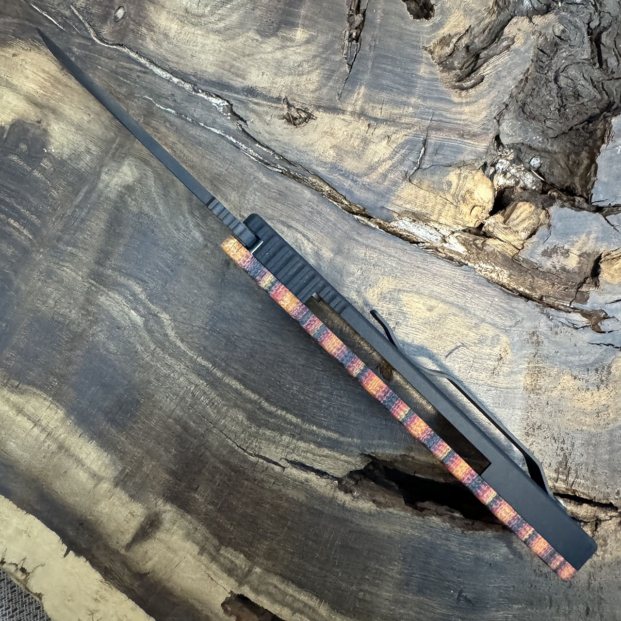 This model features black anodized 6061-T6 aluminum frame with a Gl Hansen unique micarta top. DLC finished 154-CM stainless steel chisel ground tanto blade. Satin finished hardware and DLC pocket clip for tip up carry. Mother of pearl push button. These unique micarta Pro-Tech's are awesome and no two are the exact same! Brand new in box.