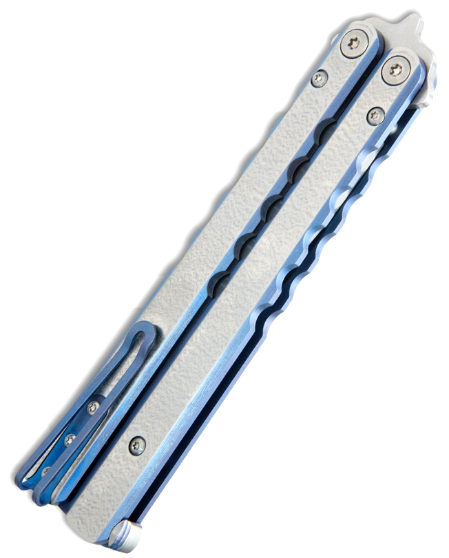 Solid 6AL4V titanium frame with silver orange peel finished flats and a light blue color on the edges. Stonewash finish 154-CM stainless steel blade. Matching titanium latch and pocket clip. Limited Edition. Brand new in handsome black display box.
