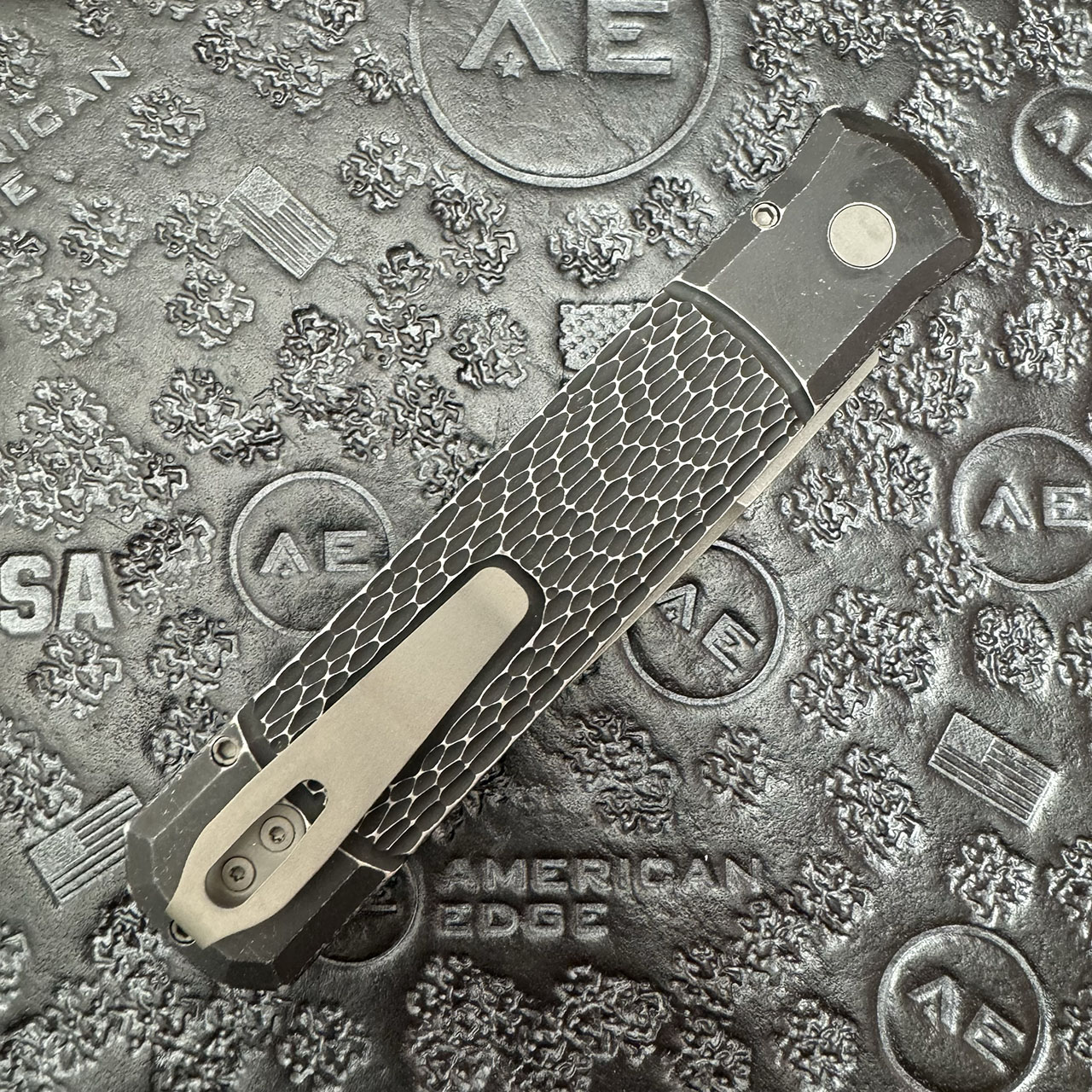 This model features jigged battleworn black anodized 6061-T6 aluminum handle scales. Acidwash finish 154-CM stainless steel bayonet style spear point blade. Blasted hardware and wide deep carry pocket clip. The blade is marked with the Pro-Tech logo and model information. Brand new in box.