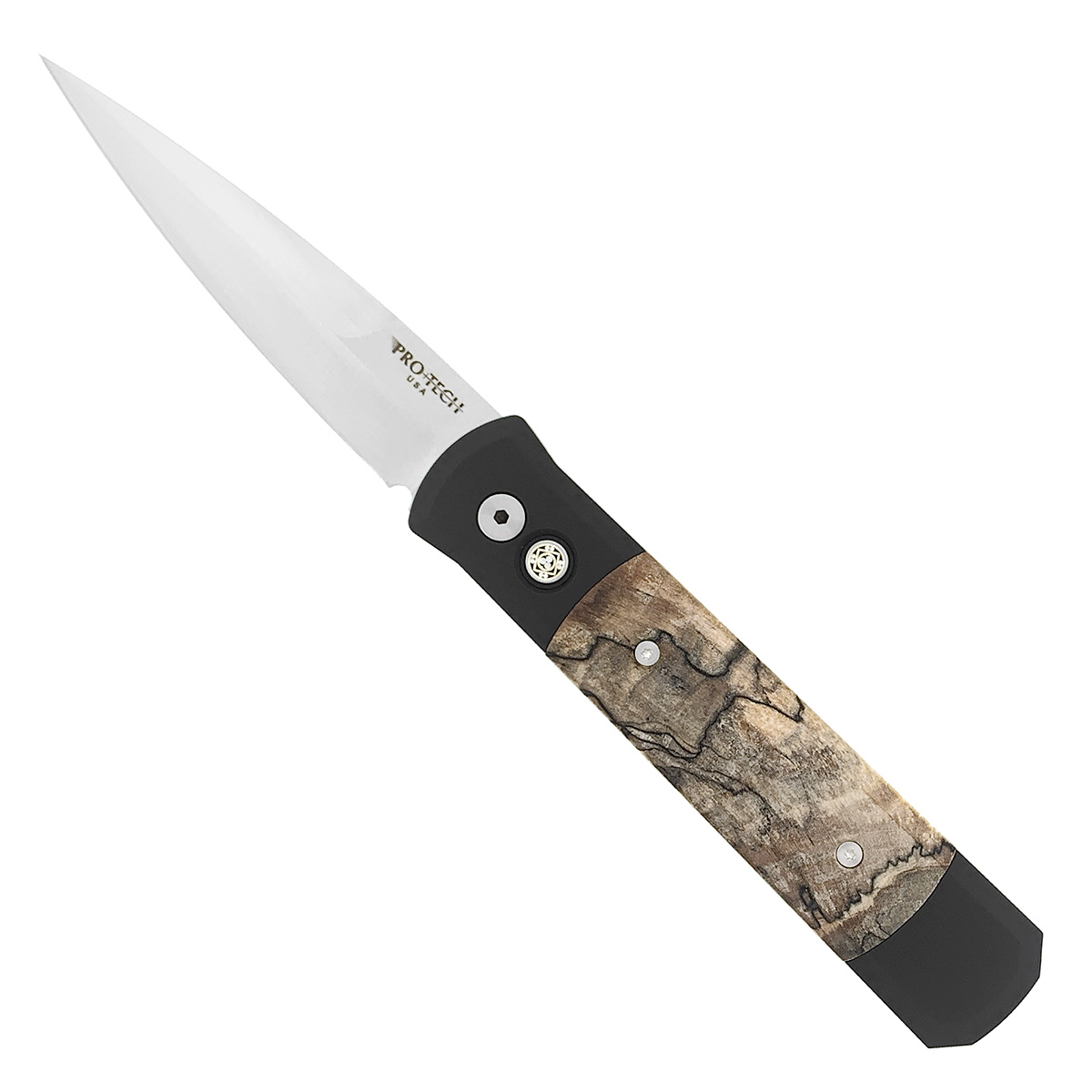 Pro-Tech Godfather Black Handle w/ Spalted Maple Inlays Satin Blade Mosaic Pin Button 906-SM