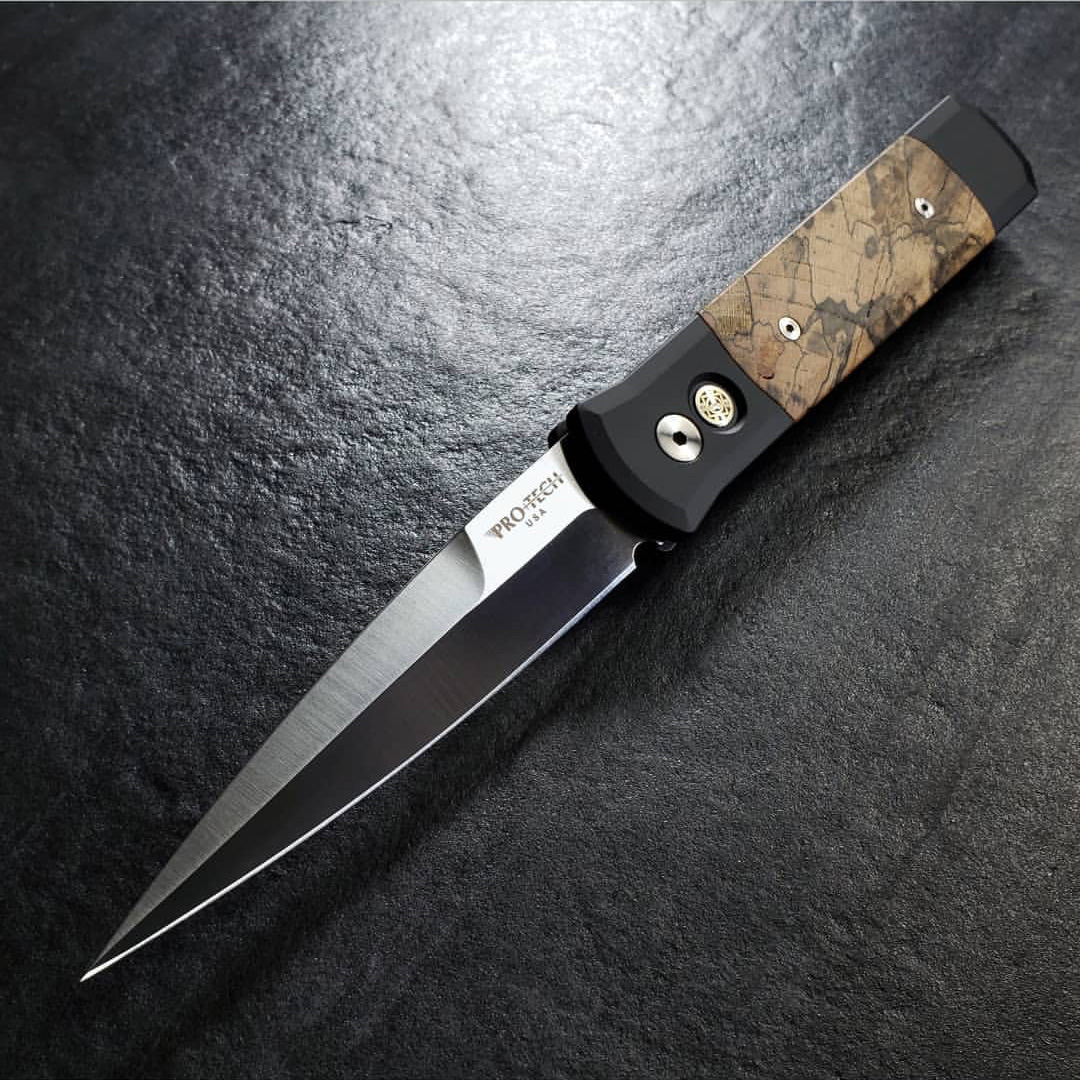The design of the Protech Godfather automatic was influenced by the original Italian Stilleto knives. It features Protech's signature bayonet style blade, a slim handle and premium materials. Pocket clip for tip up carry. The Godfather utilizes a coil spring for impressive push button action that never grows old. The build, fit and finish of the Godfather is exceptional, something that is true of all Protech knives.