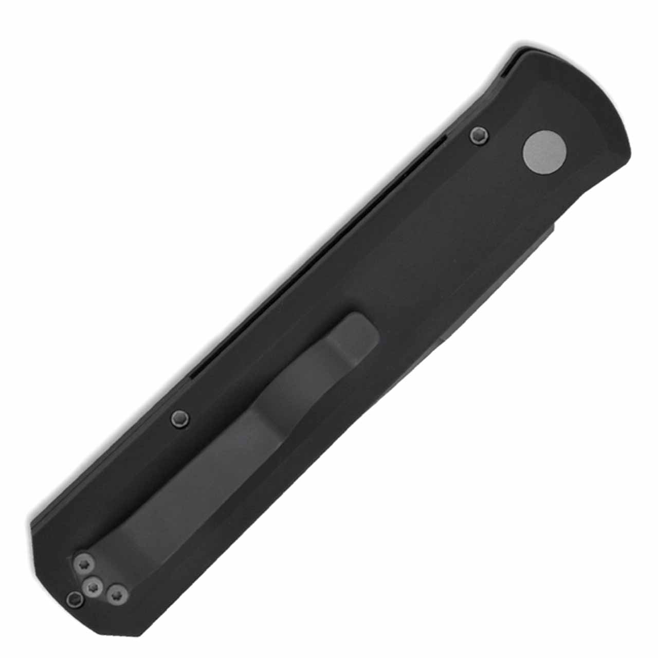 This model features solid black anodized 6061-T6 aluminum handle scales. Black DLC finished 154-CM stainless steel bayonet style spear point blade. Bead blast finished hardware and black DLC finished pocket clip. The blade is marked with the Pro-Tech logo and model information. Brand new in box.